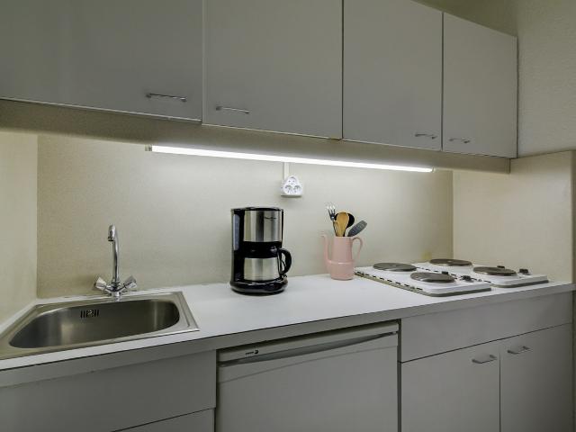 Kitchenette fermée avec plaques électriques 4 feux, micro-ondes, frigo 110 litres, cafetière à filtre. Salle de bains comprenant : baignoire, lavabo, toilettes. Sol en PVC, chambre moquette. Cellier de rangement face à l?appartement.