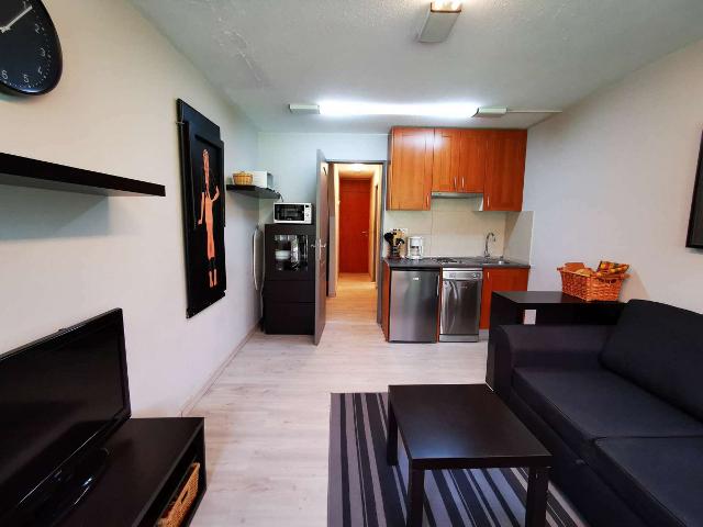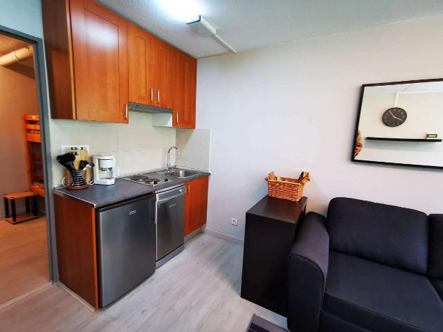 Situé au 6ème étage, surface de 24 m² avec balcon, exposition sud, face aux montagne. Séjour équipé d?une télévision, d?un canapé lit 2 places, un coin nuit en entrée avec lits superposés. Kitchenette ouverte sur séjour avec plaques à induction, four micro ondes, minifour lave vaisselle, frigo 110 litres, cafetière à filtre. Salle de douche comprenant : douche, lavabo, toilettes.