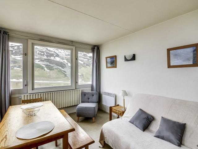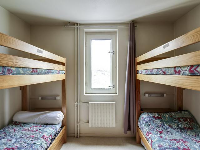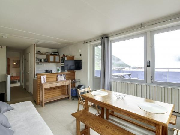 Appartement situé au 7ème étage, surface de 50 m² avec terrasse, exposition sud, face aux montagnes. Accès au Séjour par escalier intérieur, équipé d?un téléviseur, de 1 canapé lit clic clac, une chambre avec un lit en 140, une chambre avec 2 x 2 lits superposés. Kitchenette ouverte dans séjour avec plaques électriques, micro ondes, minifour, frigo 110 litres, cafetière à filtre, grille pain, bouilloire, lave vaisselle. Salle d'eau : douche, lavabo, Toilettes. Séparées. Pvc au sol. Casier à ski face à l?appartement. Animaux non autorisés.
