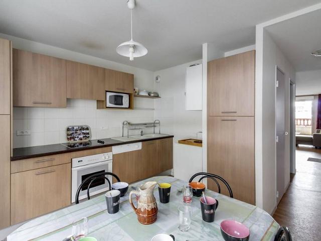 Grande cuisine avec coin repas, plaques induction 4 feux, micro-ondes, four électrique, lave-vaisselle, frigo-congélateur 200 litres, grille pain, bouilloire, cafetière à filtre et service à raclette. Salle de bain et toilettes séparées. Buanderie avec lave-linge. Sol en parquet stratifié. Appartement non fumeur. Casier à ski.