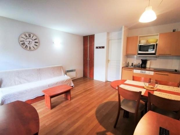 Appartement studio cabine 4 couchages, surface de 28 m² avec terrasse, exposition sud. Séjour équipé d'un canapé lit en 160 (2x80), coin repas, tv. Deux lits superposés en 90 en entrée. Coin cuisine dans séjour avec plaques vitro céramiques, micro-ondes multifonctions, lave-vaisselle. Sol en parquet. Casier à ski en RDC. Emplacement de parking couvert.( hauteur 1.95m).