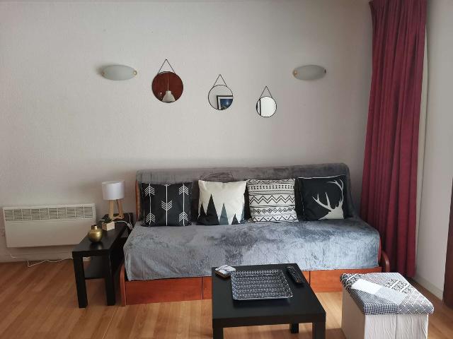 Appartement studio cabine 4 couchages, surface de 28 m² avec terrasse, exposition sud. Séjour équipé d'un canapé lit en 160 (2x80), coin repas, tv. Deux lits superposés en 90 en entrée. Coin cuisine dans séjour avec plaques vitro céramiques, micro-ondes multifonctions, lave-vaisselle, appareil à raclette et à tarte. Sol en parquet. Casier à ski en RDC. Emplacement de parking couvert n°61 au premier niveau.( hauteur 1.95m).