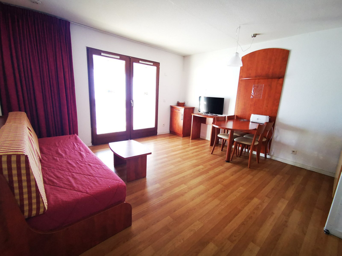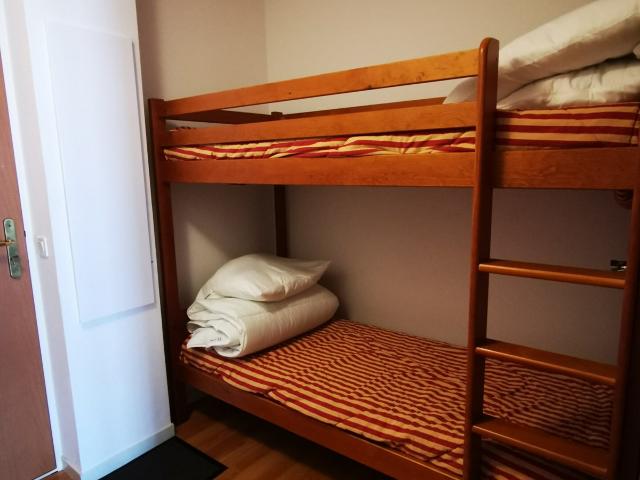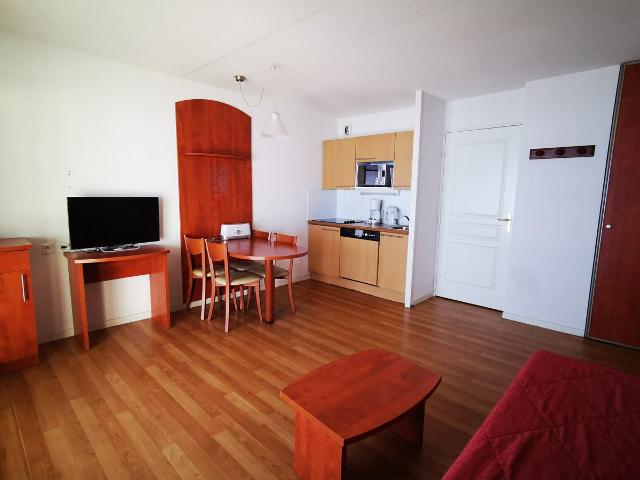 Appartement studio cabine 4 couchages, surface de 28 m² avec terrasse, exposition sud. Séjour équipé d'un canapé lit en 160 (2x80), coin repas, tv. Deux lits superposés en 90 en entrée. Coin cuisine dans séjour avec plaques vitro céramiques, micro-ondes multifonctions, lave-vaisselle. Sol en parquet. Casier à ski en RDC. Emplacement de parking couvert n°101 au premier niveau. ( hauteur 1.95m).