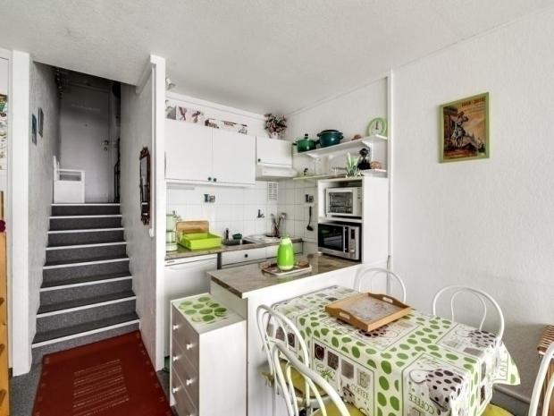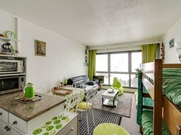 Appartement situé au 3ème étage avec ascenseur, surface de 30m² sans balcon, exposition sud avec vue sur la montagne et la station. Séjour équipé : télévision, un canapé clic clac deux personnes et deux lits superposés en 90. Kitchenette ouverte sur séjour : plaques électriques, réfrigérateur 110 litres, micro ondes multifonctions, cafetière à filtre. Salle d?eau avec lavabo et douche. Toilettes séparées. Moquette au sol.
