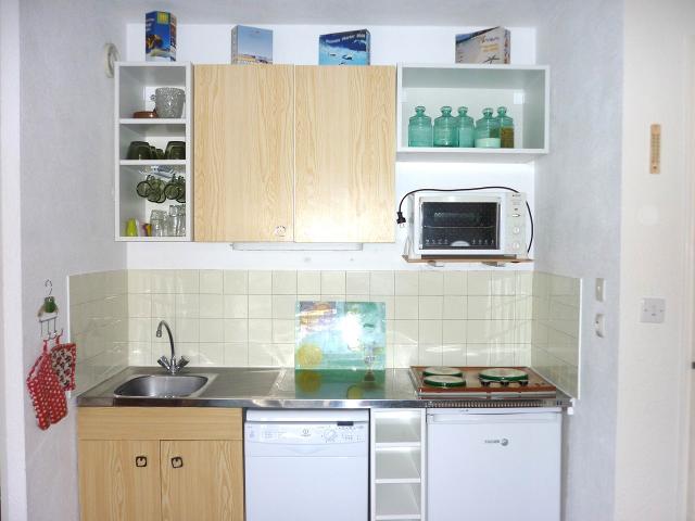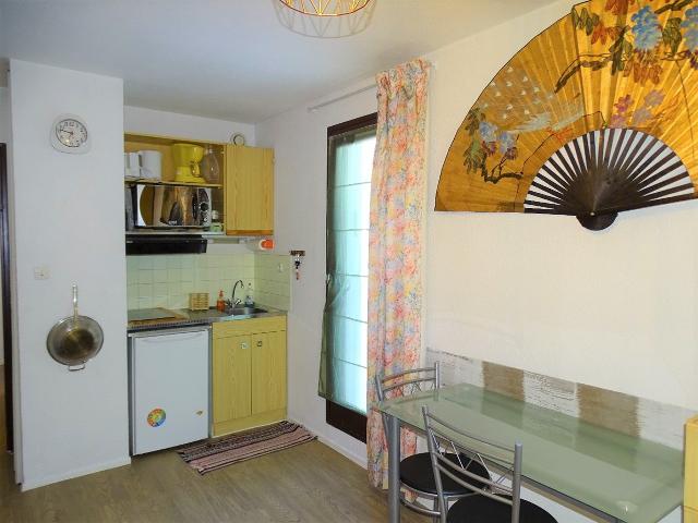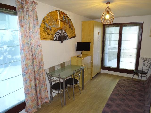 Studio en rez-de-jardin qui comprend : Une entrée avec coin cabine équipé d'un BZ convertible en couchage double 140; une salle d'eau avec wc; un séjour/kitchenette et coin salon avec clic-clac convertible 2 couchages en 140 et TV écran plat, donnant sur 2 jardinets.
