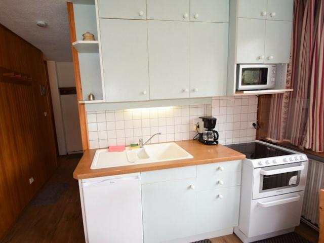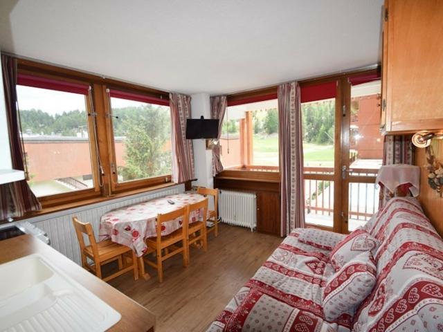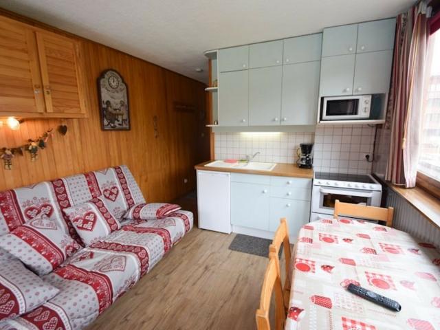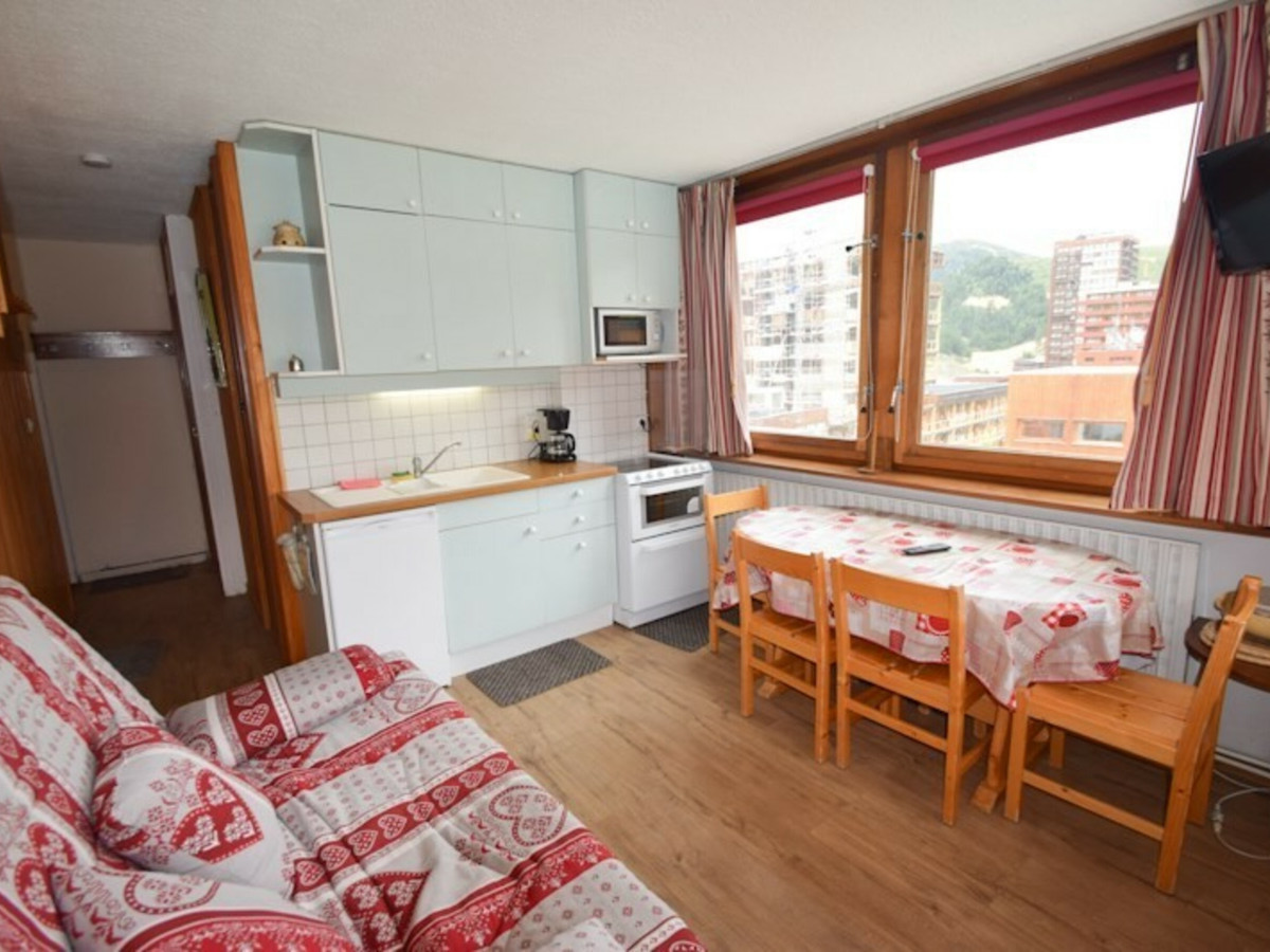 Studio cabine 3/4 pers. 23m2, balcon exposé Sud, vue sur les pistes et la station - 1er étage avec ascenseur - Cuisine dans séjour : cuisinière avec 4 plaques électriques et four et petit lave-vaisselle, réfrigérateur, micro-ondes - Séjour : canapé-lit 2 pers, coin repas, TV - Cabine (avec fenêtre) : 2 lits superposés, TV - Salle de bains : douche - WC inclus. APPT NON-FUMEUR. Literie : couvertures. Ménage de fin de séjour, draps, serviettes et forfaits ski en option.