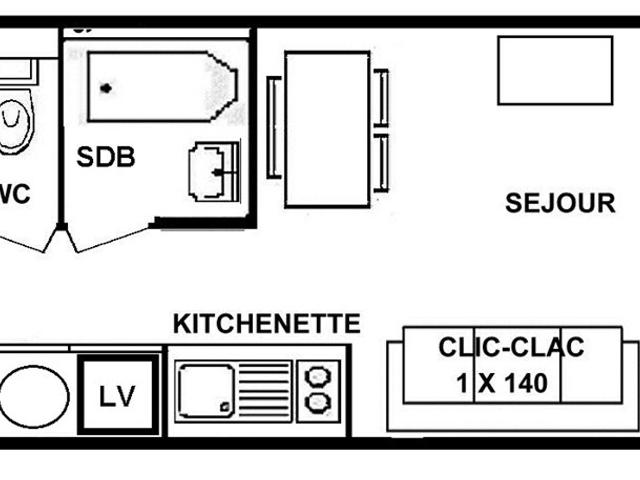 L'appartement se compose d'un séjour avec un canapé clic clac 140, d'une kitchenette équipée, d'une alcôve avec 2 lits superposés 2x90 (NB: le lit supérieur est sous la sous-pente - le lit supérieur d'un lit superposé est interdit aux - de 6 ans), d'une salle de bain et d'un WC séparé.