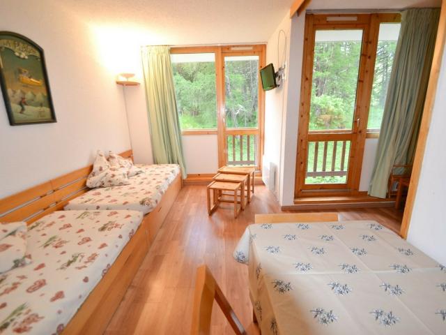 Appartement divisible 4 pers, 28m2, exposé Sud/Ouest, 2 balcons vue sur la forêt 1er étage - Cuisine : séparée, 2 plaques électriques, réfrigérateur, four, lave-vaisselle, four micro-ondes, cafetière électrique. Séjour : coin repas, 1 canapé-lit 2 pers - TV - Partie divisible : 2 lits 1p - SDB : baignoire - WC séparés - Literie : couettes -Casier à skis N° 07 au RDC - Séjour séparé en 2 par une paroi coulissante. Sols : parquet flottant sauf entrée/wc/sdb : carrelage. L?appartement se situe au niveau 1er étage de la résidence, accès par escaliers. Ménage final, draps, serviettes et forfaits ski en option.