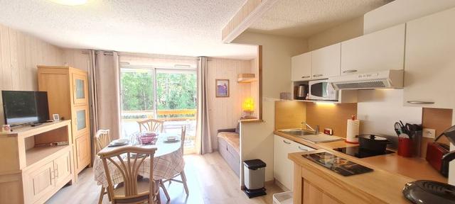 - Charmant séjour avec canapé-lit (1x2 pers, 140x190) et télévision ; - Balcon avec vue nature ; - Cuisine équipée (réfrigérateur, congélateur, micro-ondes, bouilloire, grille-pain, four, lave-vaisselle, cafetière à dosettes SENSEO , appareil à raclette et fondue, vaisselle et ustensiles de cuisine) ; - Cabine : lit double (1x2 pers, 140x190) - Une salle de bain avec baignoire, porte-serviette, sèche-serviette, sèche-cheveux, et WC indépendants ; - Le logement dispose d'un casier à skis ; - Le logement est équipé de draps, couettes et d’oreillers ; - Parking extérieur privé et gratuit selon disponibilité et non garanti