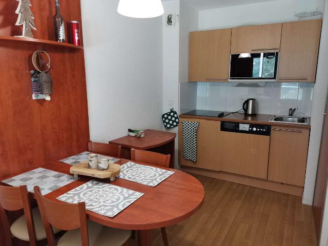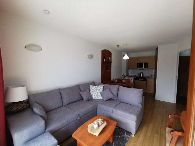 Appartement 2 pièces 4 couchages situé au 1er étage sans ascenseur, surface de 33 m² avec terrasse, exposition sud. Séjour équipé d'un canapé lit en 140, coin repas, téléviseur. Chambre avec un lit en 160. Coin cuisine dans séjour avec plaques vitro céramiques, micro-ondes multifonctions, bouilloire, lave vaisselle, grille pain. Sol en parquet. Casier à ski. Parking couvert n°9 RDC. ( hauteur 1.95m).