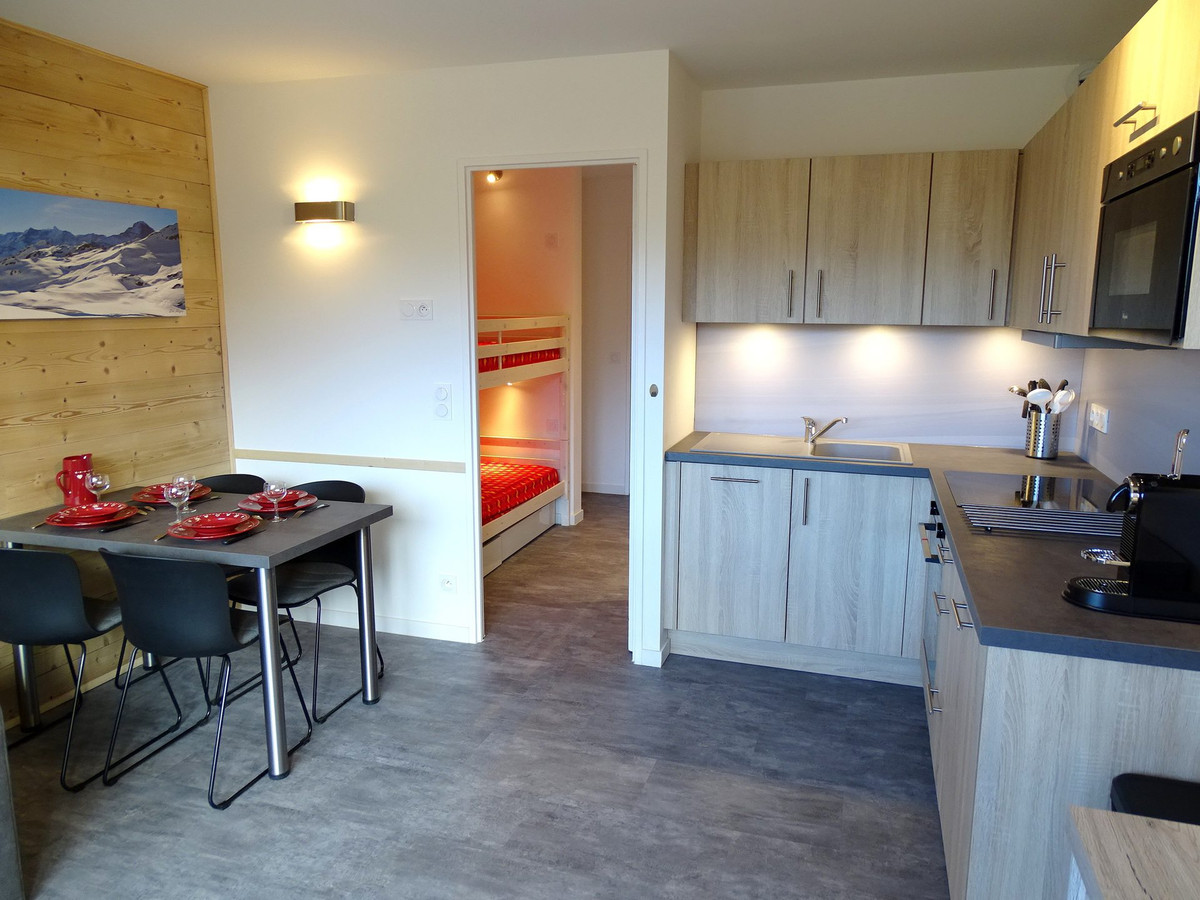 Dans la première pièce, vous trouverez la cuisine entièrement équipée (lave-vaisselle, minifour, four micro-ondes, cafetière, grille-pain...), les premiers couchages : soit un lit en hauteur, une banquette lit (et possibilité de lit gigogne se mettant à hauteur pour former un lit double) et une TV.