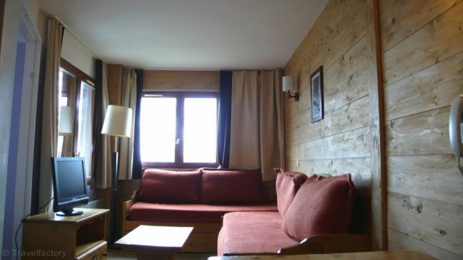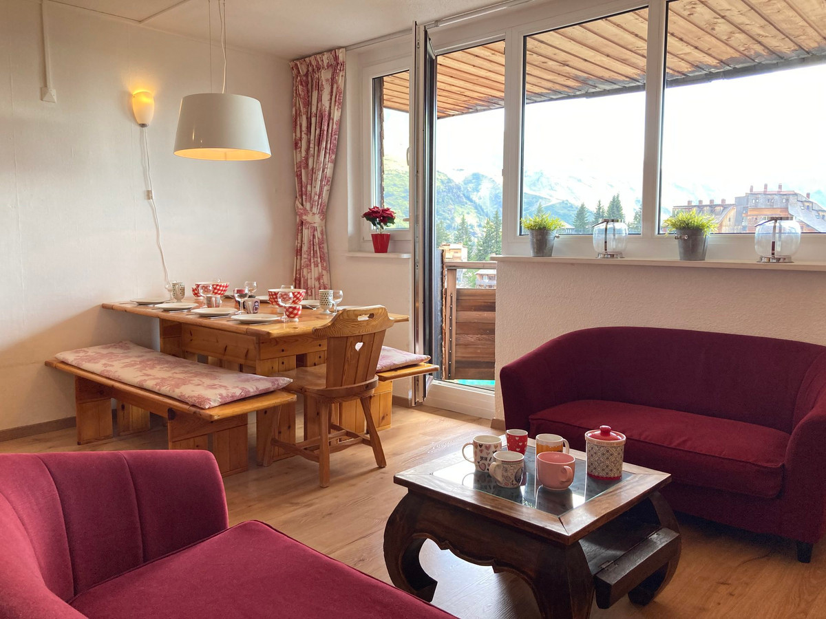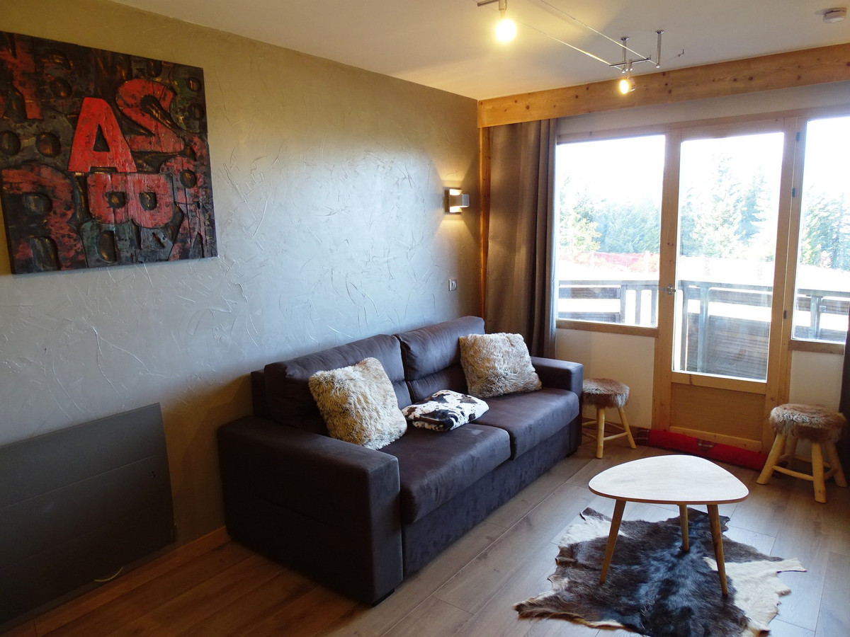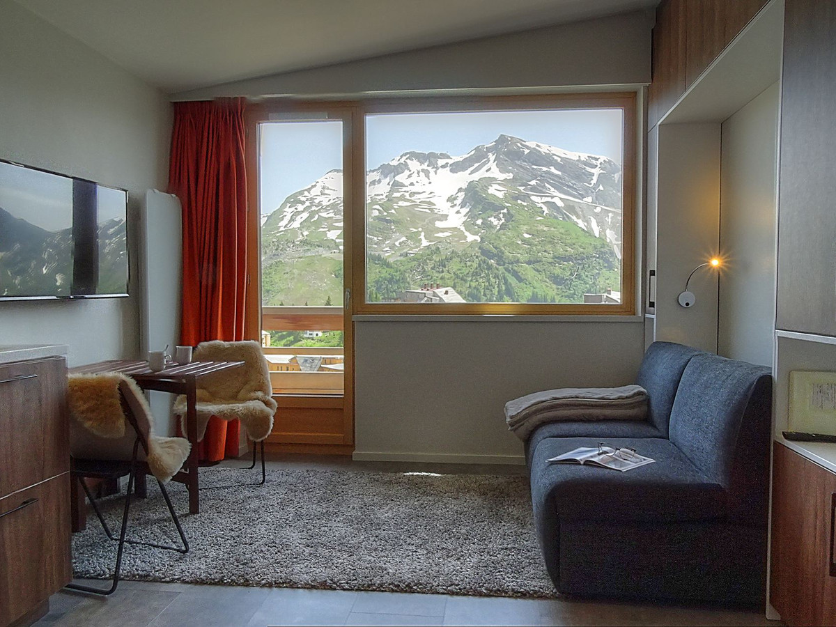 Séjour avec canapé lit (système rapido 140x190), balcon exposé ouest avec une très belle vue sur la montagne et la vallée.