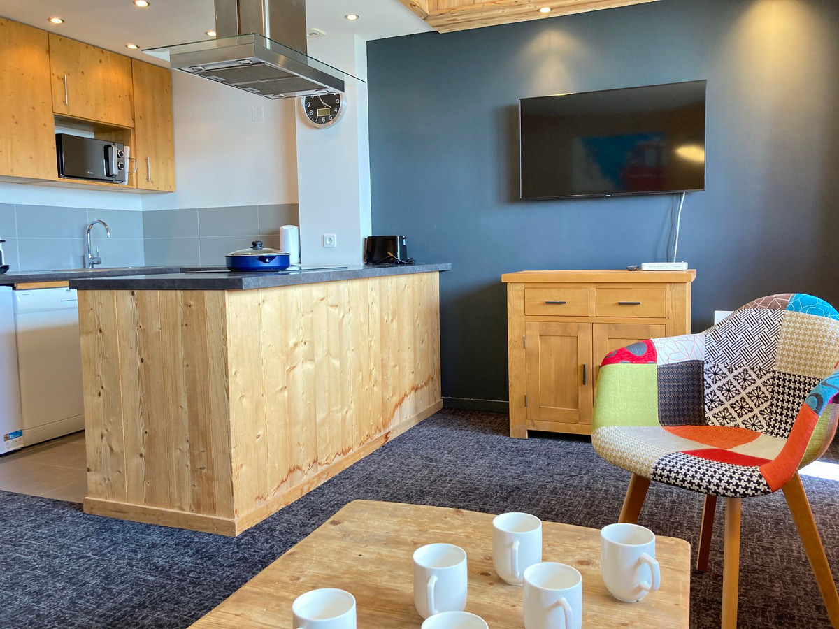 Sa situation au 8ème et dernier étage de la résidence lui offre un superbe panorama. Situé au coeur de la station, vous êtes à proximité immédiate des commerces, de l'office du tourisme, des caisses de remontées mécaniques, et du Village des Enfants.