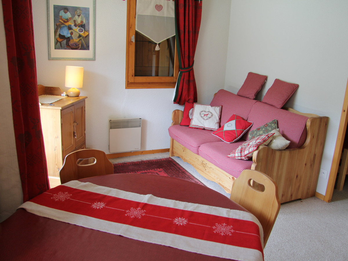 Entrée / Hall : Placard-penderie - Chambre (5.75 m²) : 3 lits, fenêtre est vue sur les terrains de tennis - Salle d'eau : Cabine douche, lavabo - wc - Séjour (15 m²) : Coin salon : Canapé, télévision, baie vitrée sud accès balcon (4 m²) vue montagne - Coin repas : Table et chaises - Coin cuisine équipée : Cuisinière électrique avec four, réfrigérateur (90L), placards.