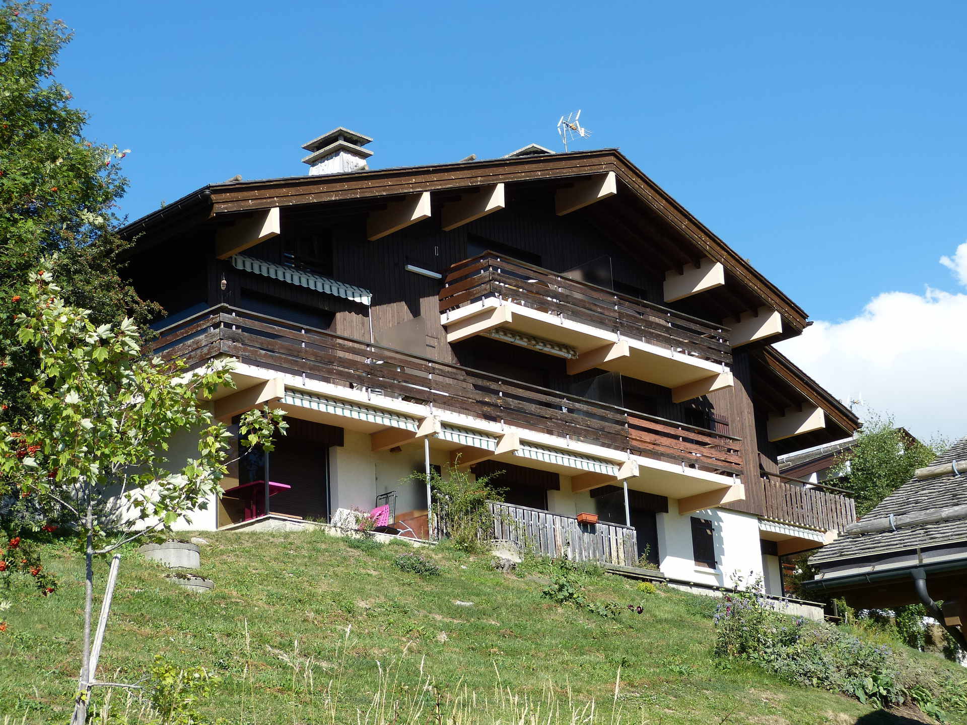 Entrée/Hall : wc - Cuisine (10 m²) : Plaques 4 feux gaz, four, micro-ondes, lave-vaisselle, réfrigérateur (80L), cafetière à filtre, bouilloire, grille-pain, appareil à raclette, placards - Salle de séjour (20 m²) avec coin repas : Table et chaises - Coin salon : Canapé, télévision, cheminée (insert), porte fenêtre accès balcon-terrasse vue village et chaine des Aravis - Chambre 1 (14 m² ) : lit, penderie, fenêtre nord, vue chalet, lavabo avec miroir mural, douche à l'italienne - Chambre 2 (7.60m²) : Lits, lavabo, douche, penderie, baie accès terrasse et fenêtre Sud Est - mobilier de jardin : table haute avec tabouret, 2 transats - Garage 1 voiture - Buanderie avec lave-linge - Barbecue Weber l'été - Chauffage central au fuel + solaire - Couettes - Animaux interdits.