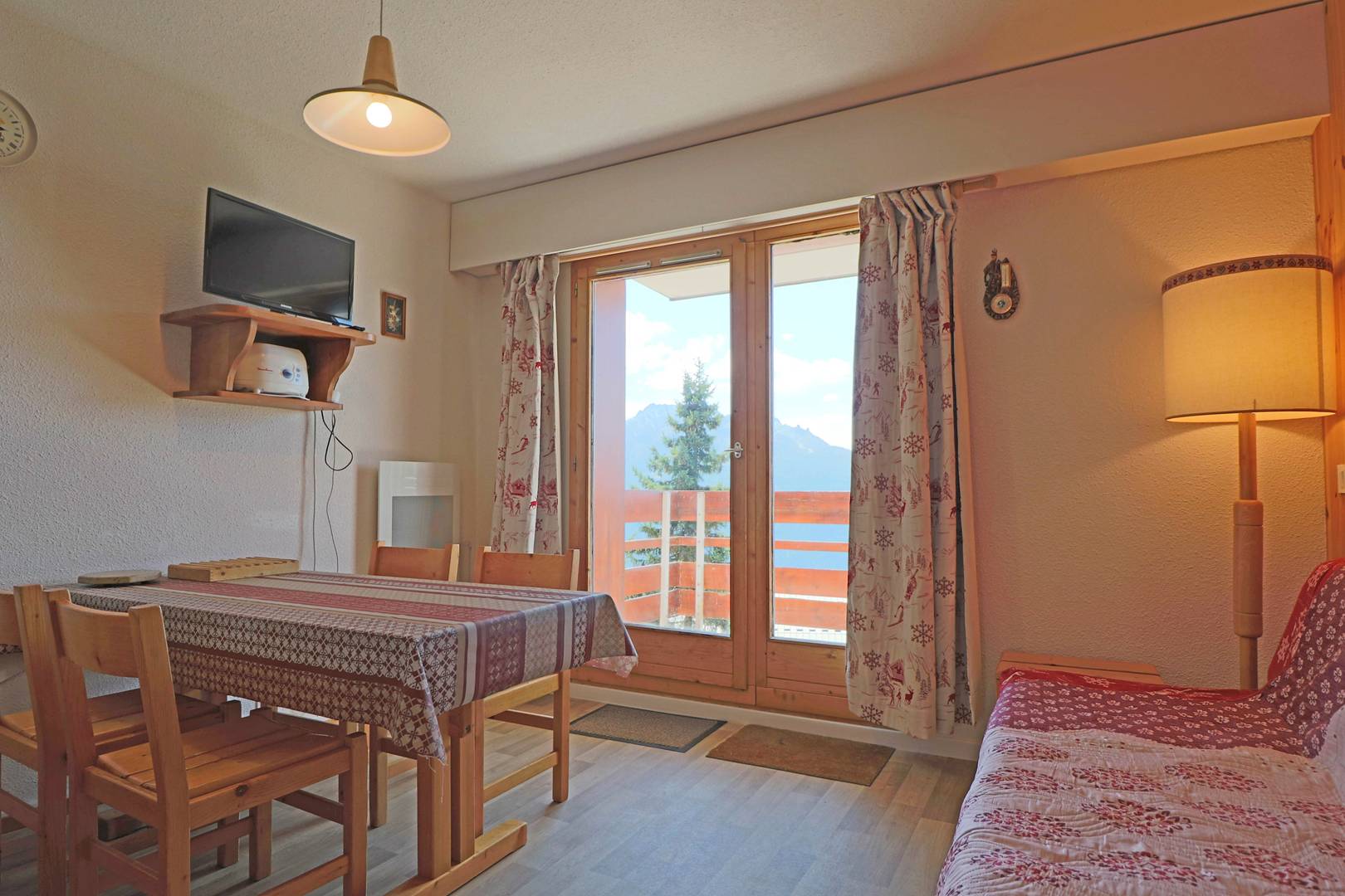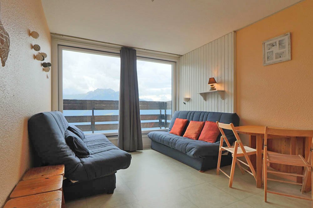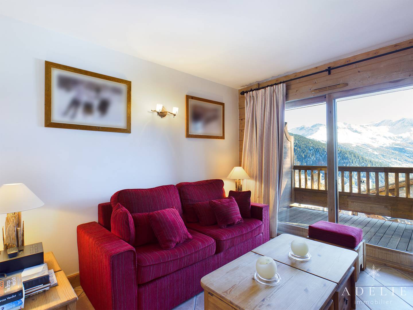 Séjour avec canapé, TV, balcon exposé Sud avec une belle vue sur la vallée