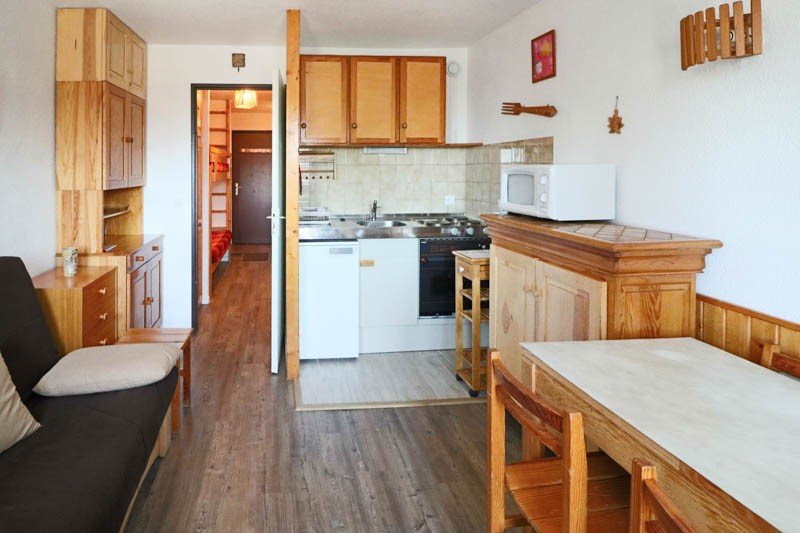 Jolie Studio 21 m² pour 4 personnes, avec à l'entrée 2 lits superposés, un séjour avec canapé clic-clac, coin repas, télévision, kitchenette avec plaques électriques, four multi-fonctions, une salle de bain avec baignoire et wc séparé.