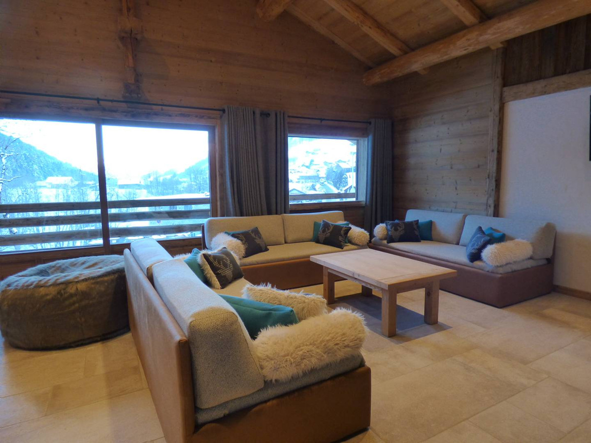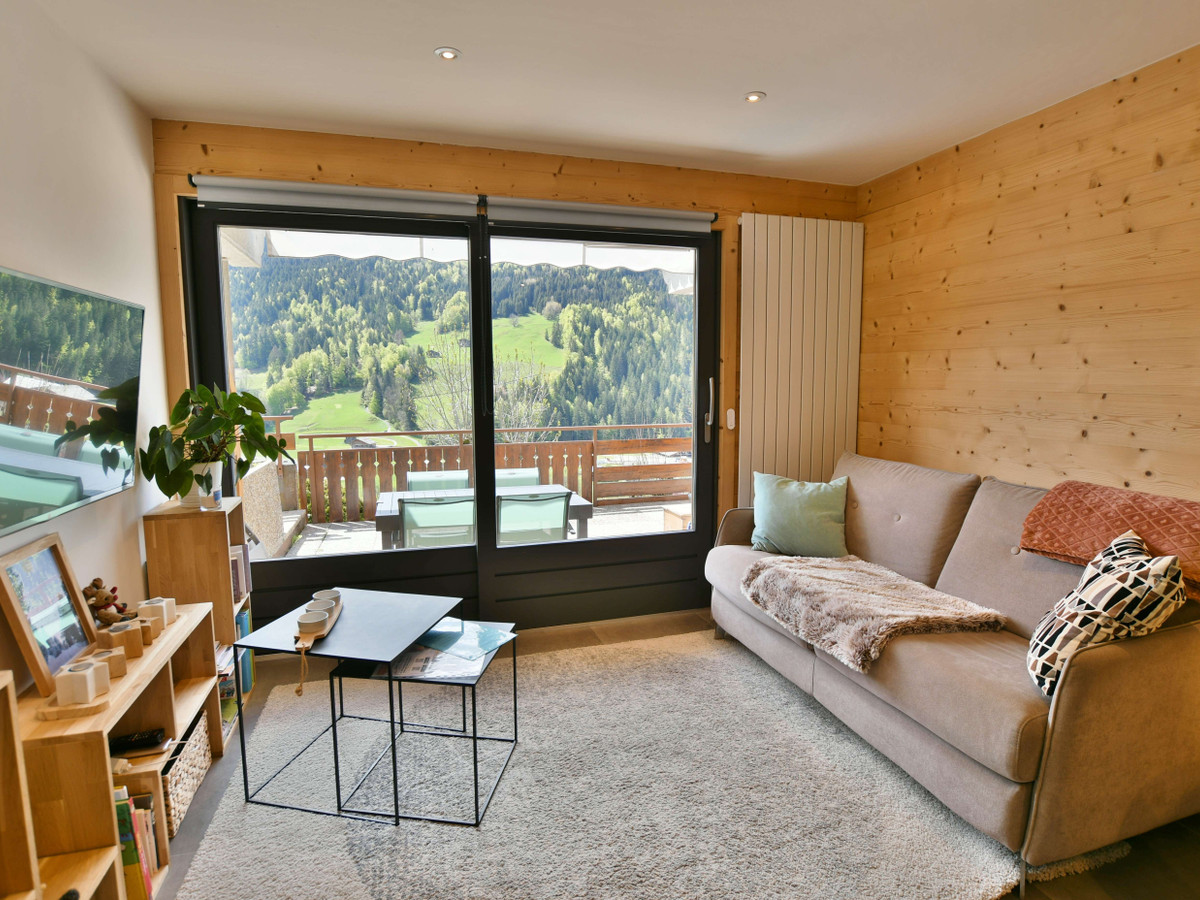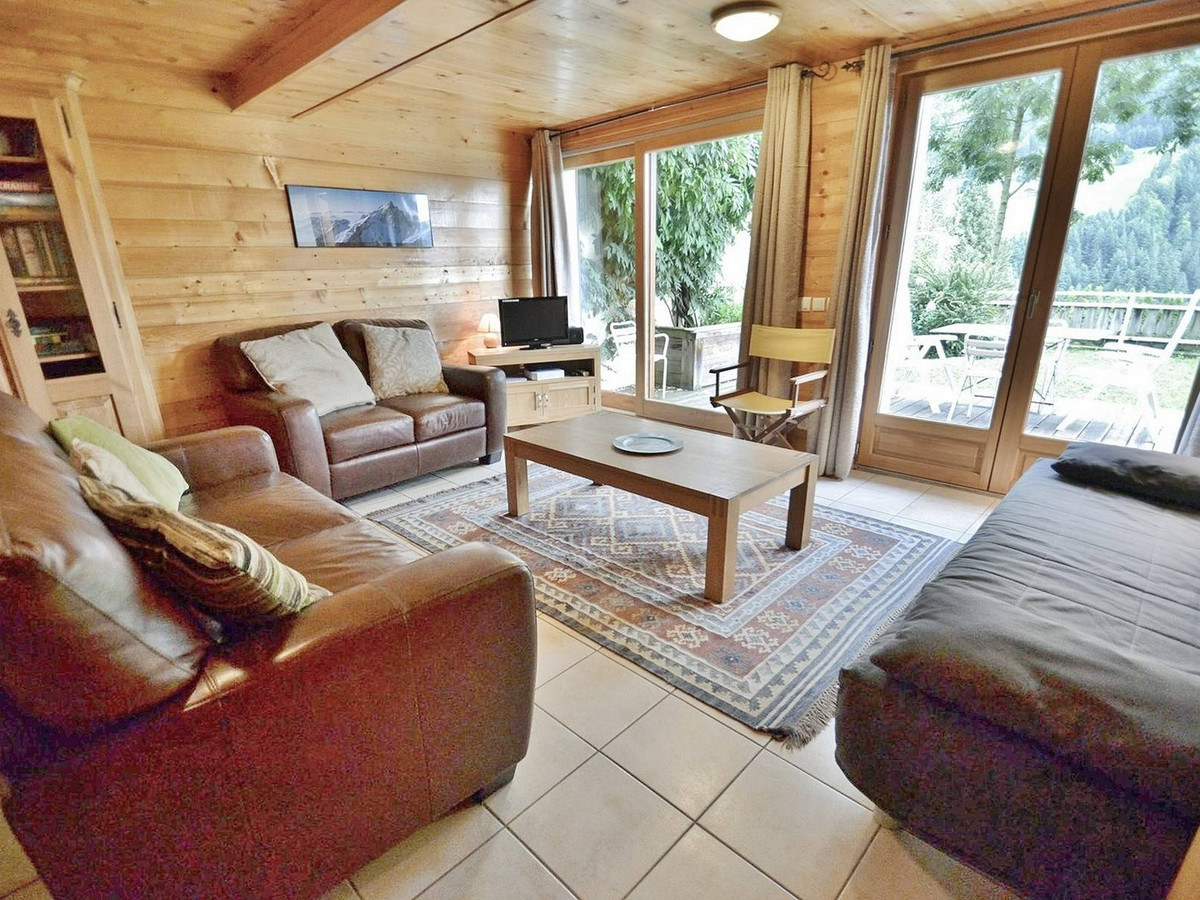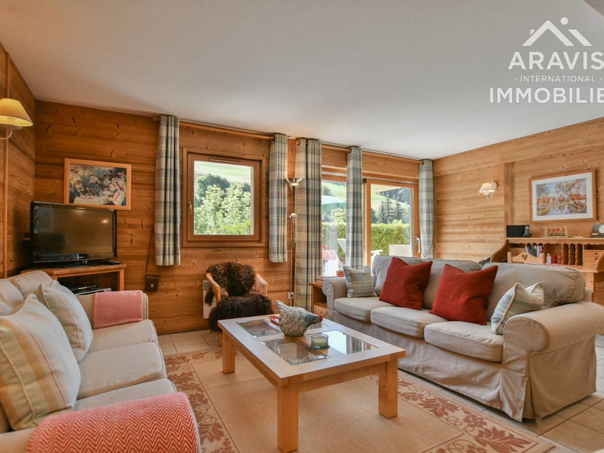 Le salon est confortable et à une TV avec chaines TNT et donne accès à une grande terrasse/jardin face sud, qui fait toute la longueur de l'appartement. Cette terrasse en bois ainsi que la partie en pelouse est idéale pour se prélasser au soleil avec une vue imprenable sur le village et son clocher ainsi que la magnifique chaîne des Aravis !