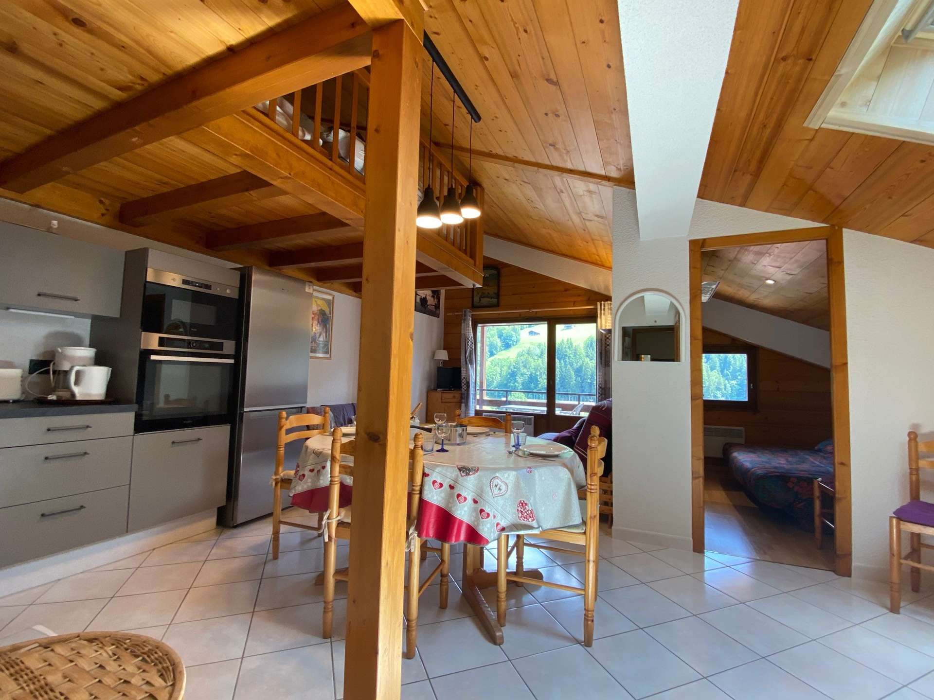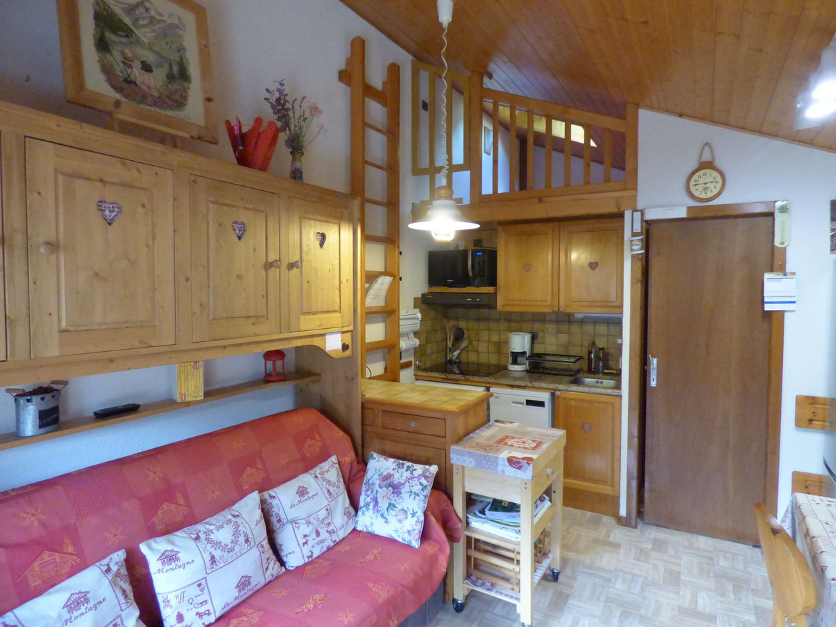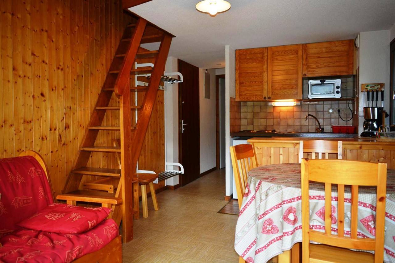 Cet appartement de vacances au 1er étage comprend un séjour avec un canapé convertible 2 personnes et télévision, un balcon avec vue sur domaine skiable et vue légère sur la Colombière, un coin cuisine équipé, une cabine avec 2 lits superposés, une salle de bain avec WC. A l'étage, une mezzanine avec 1 lit double et un WC avec lave-main .