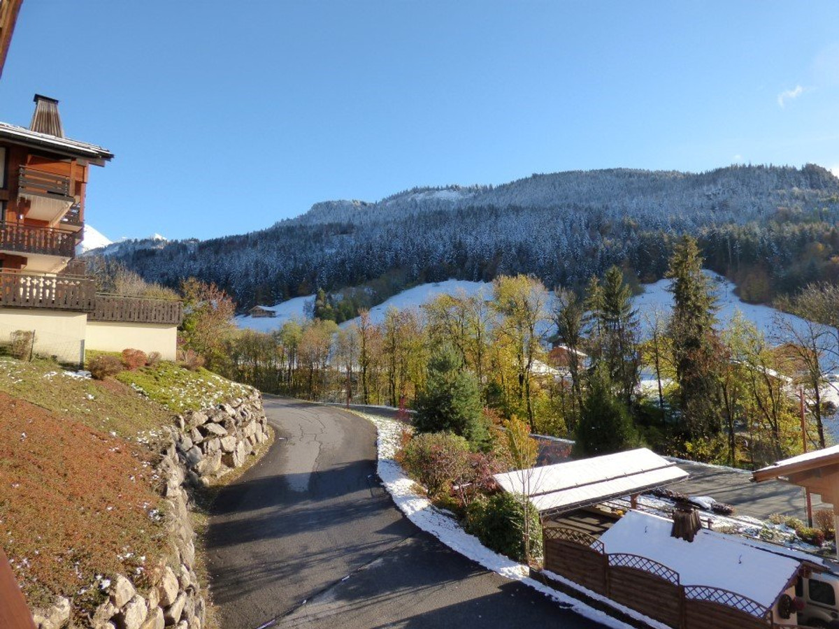 Les Plus de cette location à la montagne : vue principale sur le village et légère vue sur les Aravis, casier à ski, appartement ensoleillé, arrêt navette à proximité.