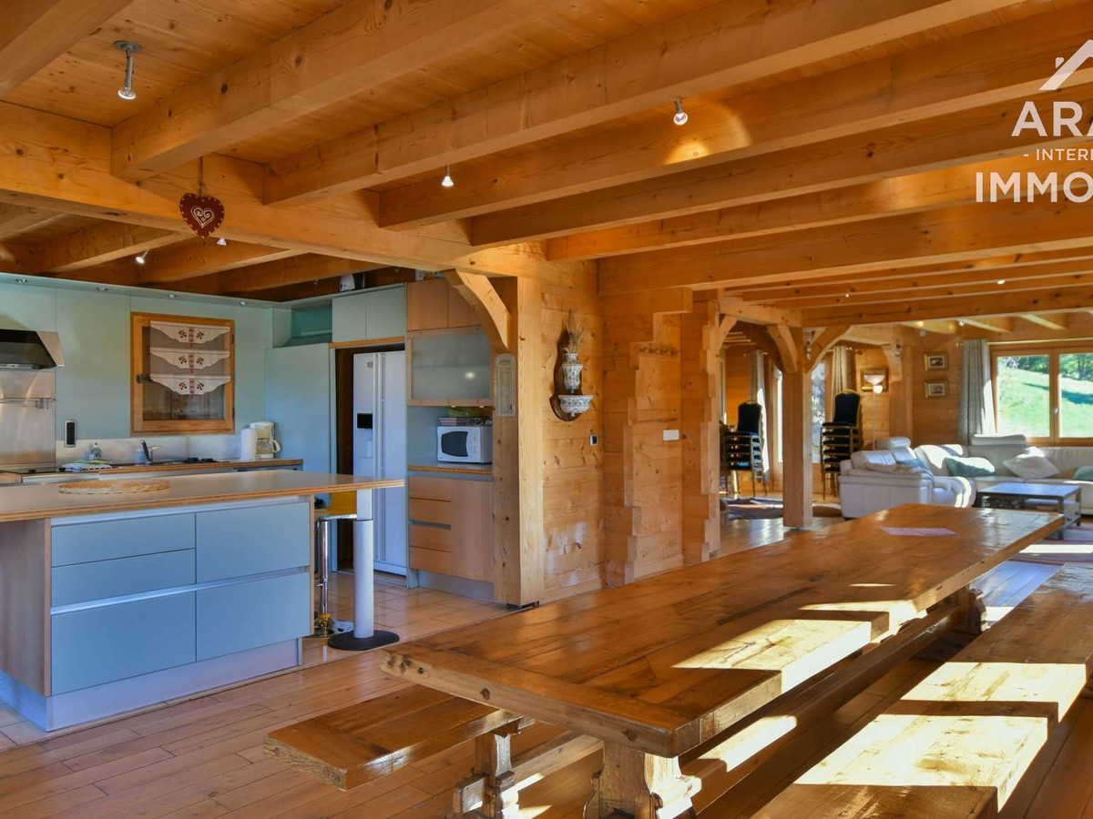 La salle à manger spacieuse et conviviale s'ouvre sur un balcon couvert exposé Sud-Ouest, offrant une vue dégagée sur les montagnes. Profitez de soirées chaleureuses grâce au poêle à bois du séjour, entouré d'une décoration soignée qui réchauffe l'ambiance.