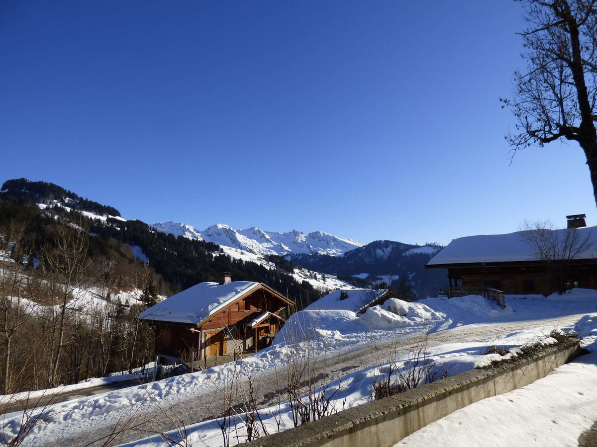 Un balcon exposition Sud avec vue sur le village du Grand-Bornand et la chaine des Aravis