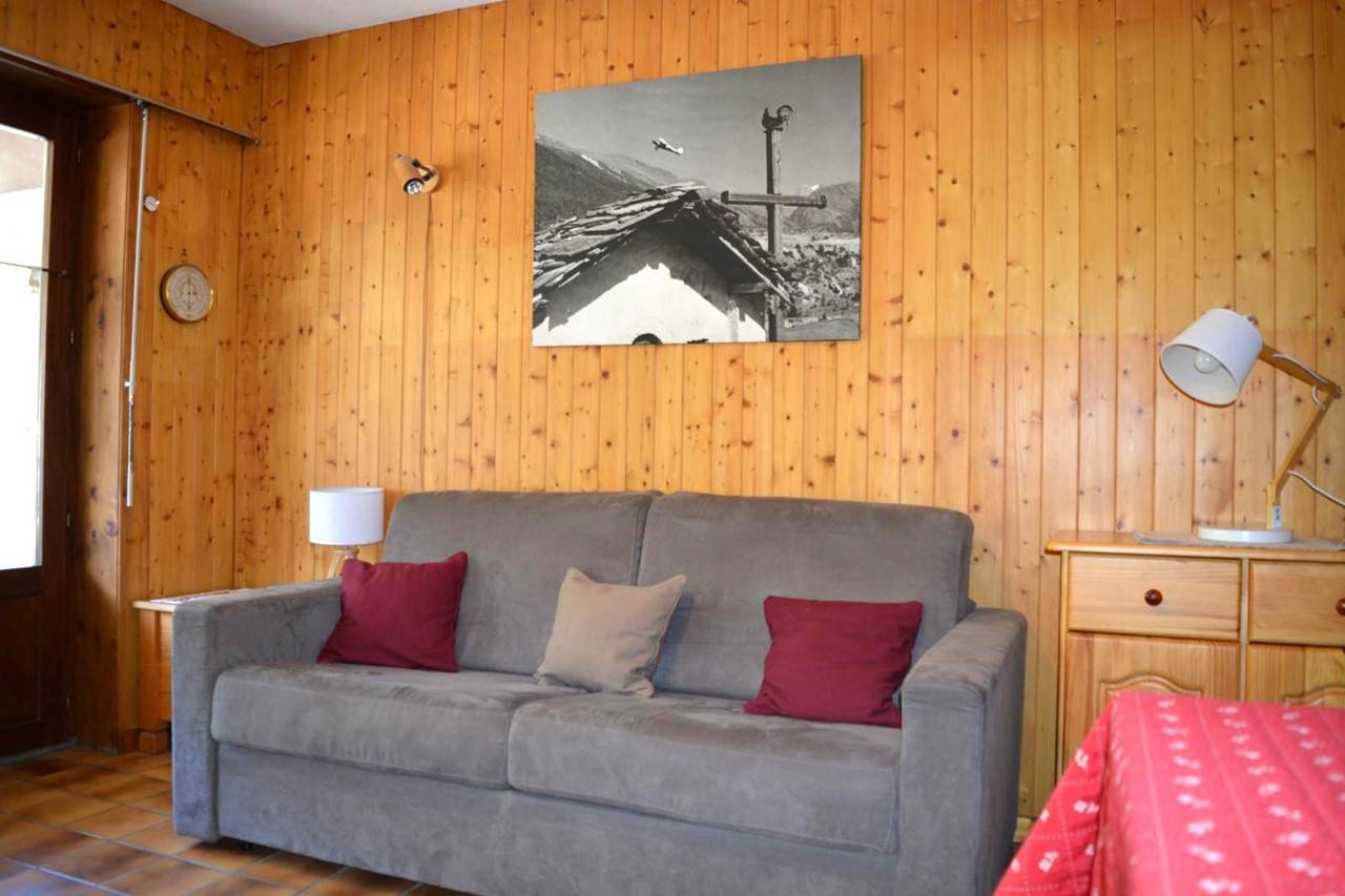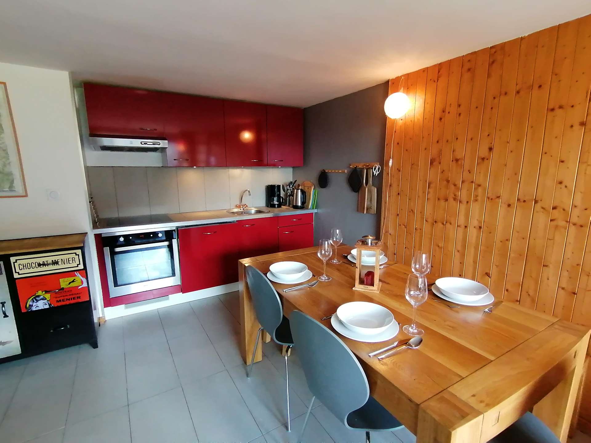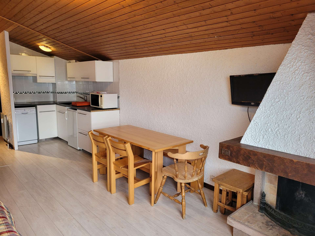 Cet appartement de vacances au 1er étage comprend un séjour avec canapé convertible 2 personnes et télévision, un coin cuisine équipé d'un lave-vaisselle, une alcôve avec 2 lits superposés, une salle de bains et un WC indépendant. Balcon Sud, casier à ski, parking collectif privé de la résidence.