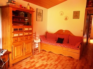 L'appartement est constitué d'une chambre avec un lit double, armoire et rangement, et d'un coin montagne avec un lit superposé séparé de la pièce par un rideau. La pièce principale comporte un coin cuisine, un coin salle à manger et un espace salon. La salle de bain possède une machine a laver et les toilettes sont séparées.