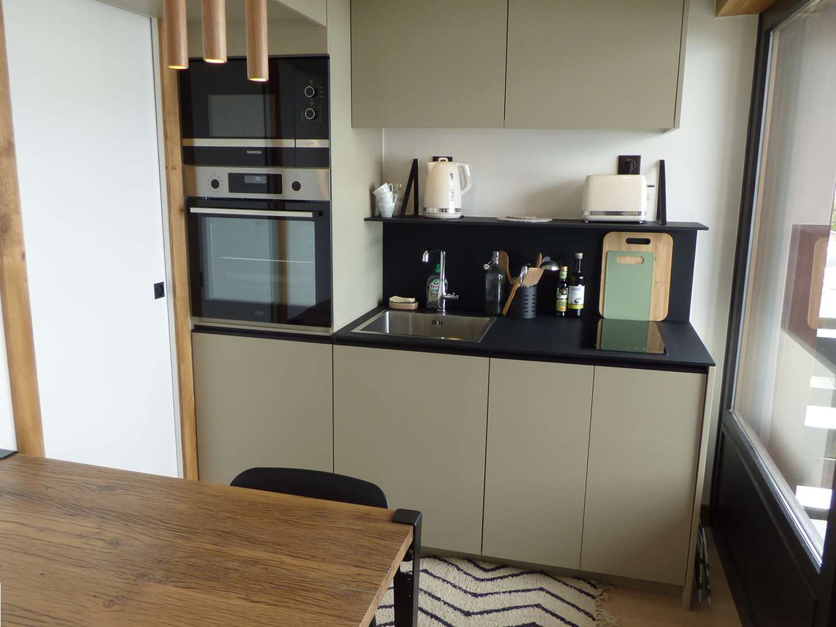 Une cuisine équipée ouverte sur le séjour avec canapé convertible x130