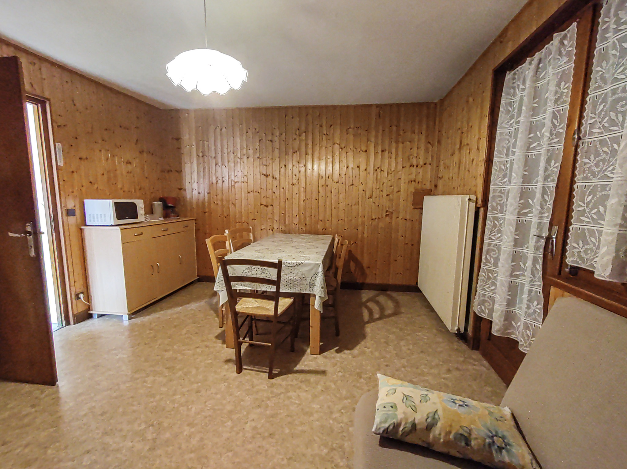 Salle à manger/Séjour avec grandes baies vitrées et cuisine ouverte entièrement équipée (Cuisinière éléctrique 4 feux et four, lave-vaisselle, bouilloire, grille-pain, machine à café), canapé convertible (140)