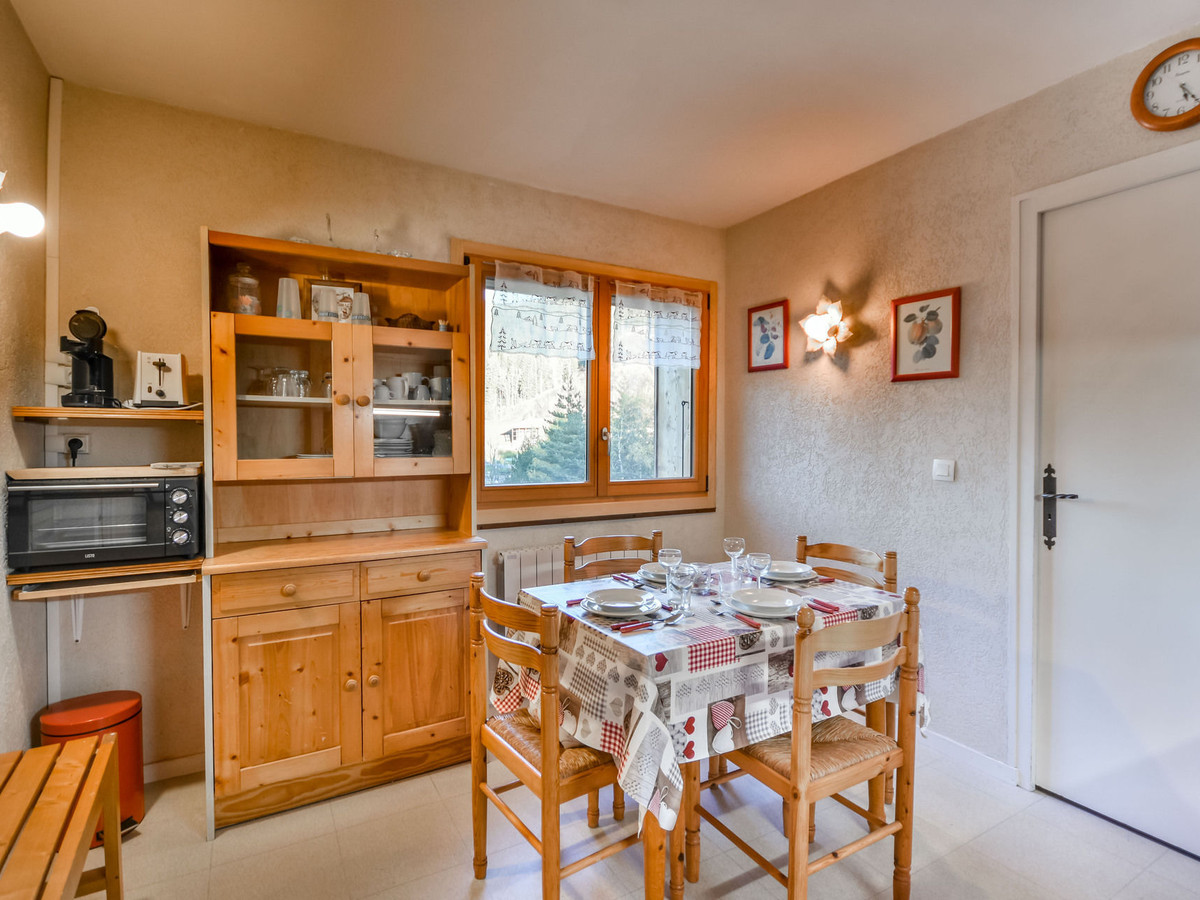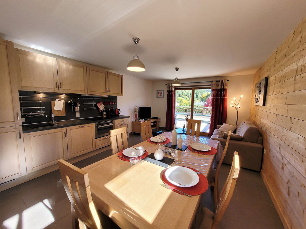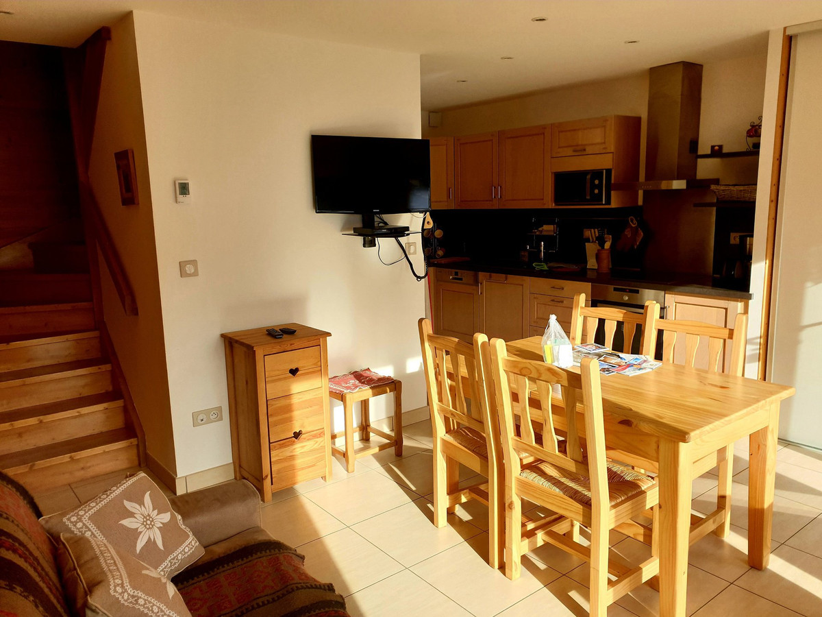 - 1 salon-séjour avec un canapé lit pour 2 personnes et 1 banquette, cuisine bar équipée ouverte sur le séjour. Accès sur balcon par baies vitrées, vue sur les pistes de ski.