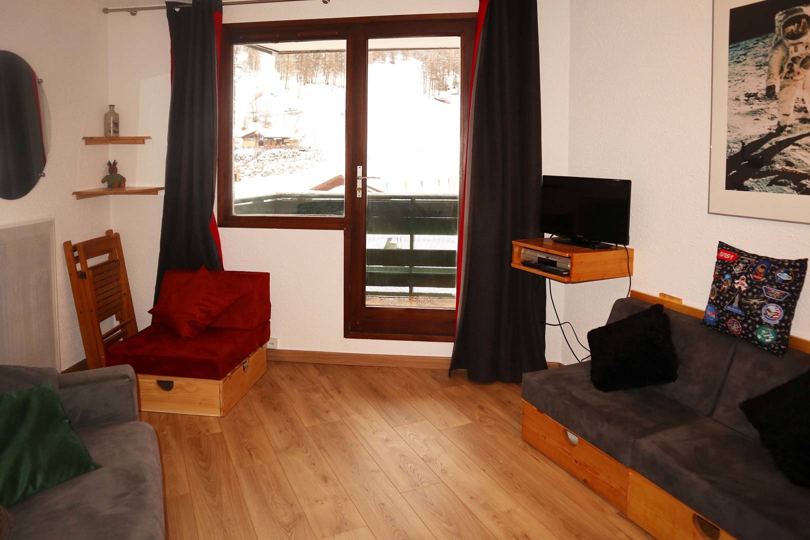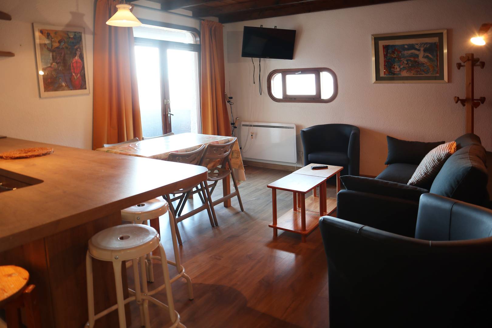 Studio équipé pour 4 personnes composé d'une entrée avec 2 lits superposés 1 places d'un séjour avec 1 banquette convertible 2 places, salle de bains et wc séparés, coin cuisine ouvert sur le séjour, balcon exposé Ouest avec vue sur la vallée.