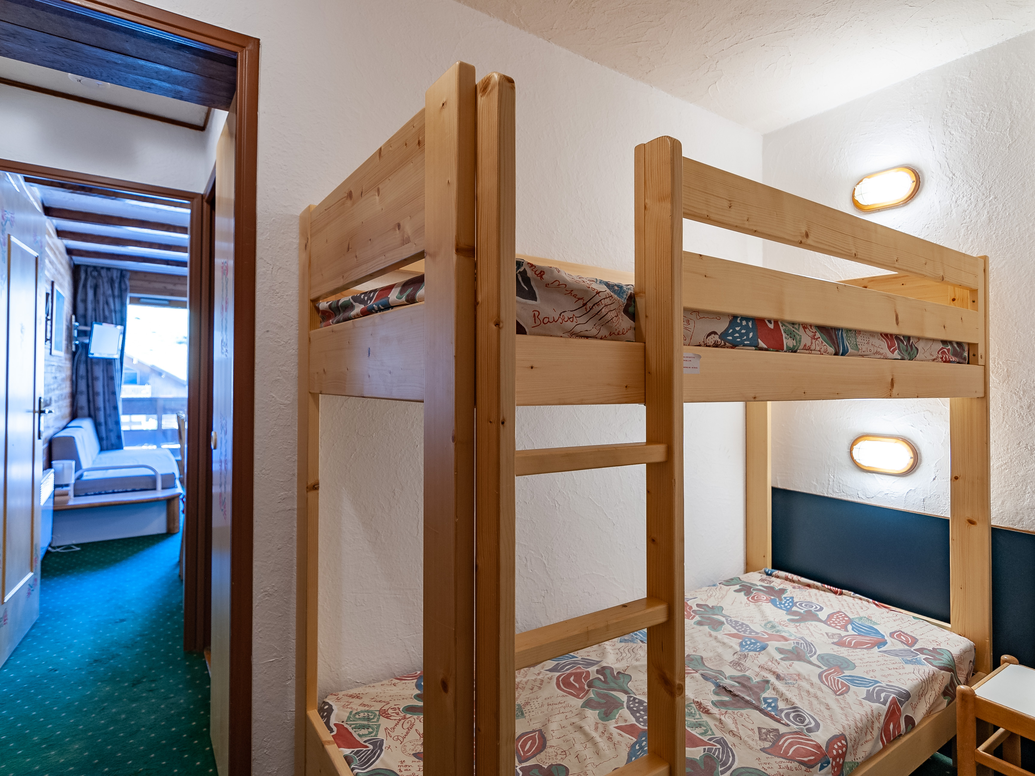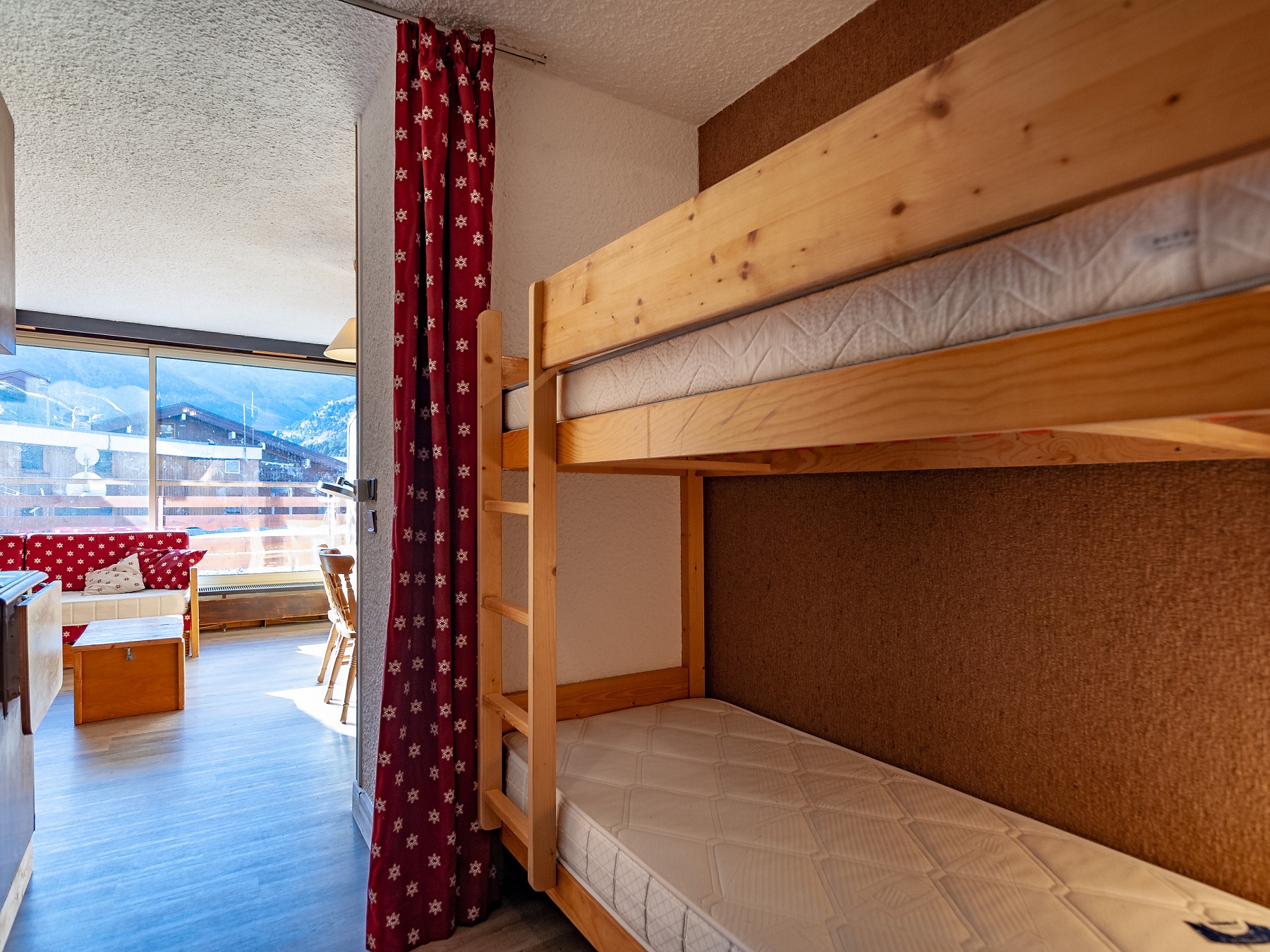 Coin montagne avec un ensemble de lit superposés (80x190). Kitchenette équipée de plaques électriques, four mixte, lave vaisselle, réfrigérateur, bouilloire, grille-pain, cafetière Nescafé Dolce Gusto. Salle de bains avec wc. Casier à skis et ascenseur dans la résidence. Appartement non fumeur.
