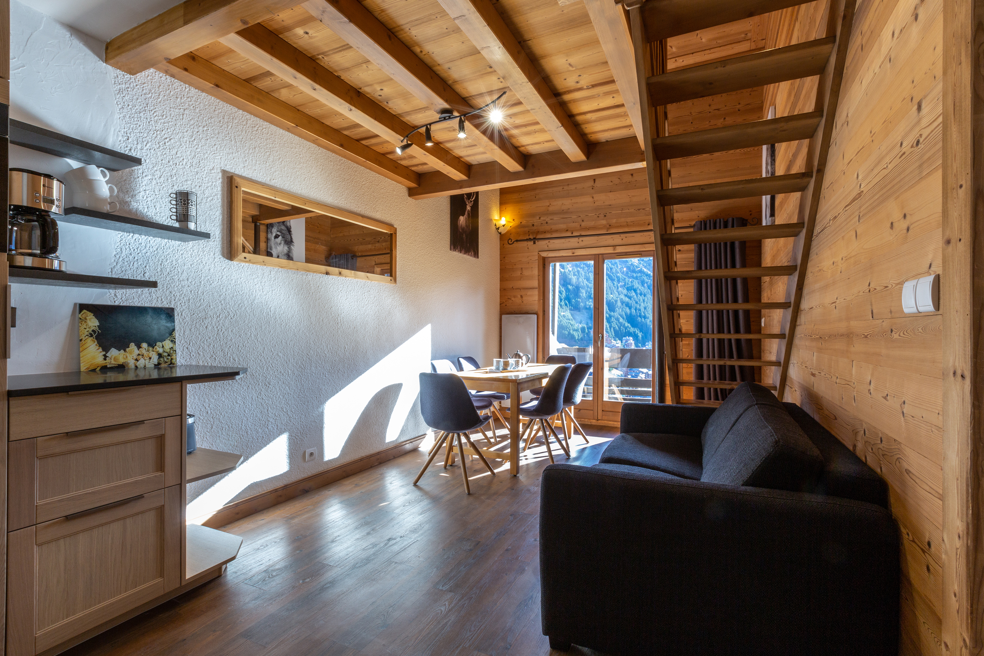 L'appartement Sherpa 009 d'une surface de 36 m2 est exposé Sud avec une belle vue sur le Mont Vallon.