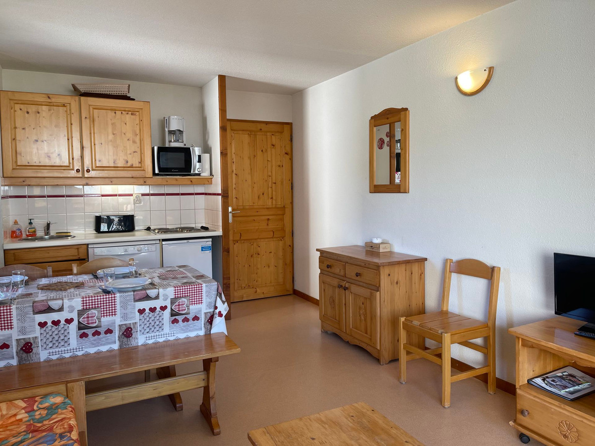 L'appartement dispose d'une entrée avec rangement, d'une salle de bain avec baignoire, de toilettes séparées, ainsi que d'une chambre inférieure à 1,80 mètres. Le séjour est équipé d'un canapé, d'une télévision et d'un coin cuisine.À l'étage, vous trouverez une mezzanine fermée inférieure à 1,80 mètres. Profitez également du balcon orienté nord qui offre une magnifique vue sur la montagne.