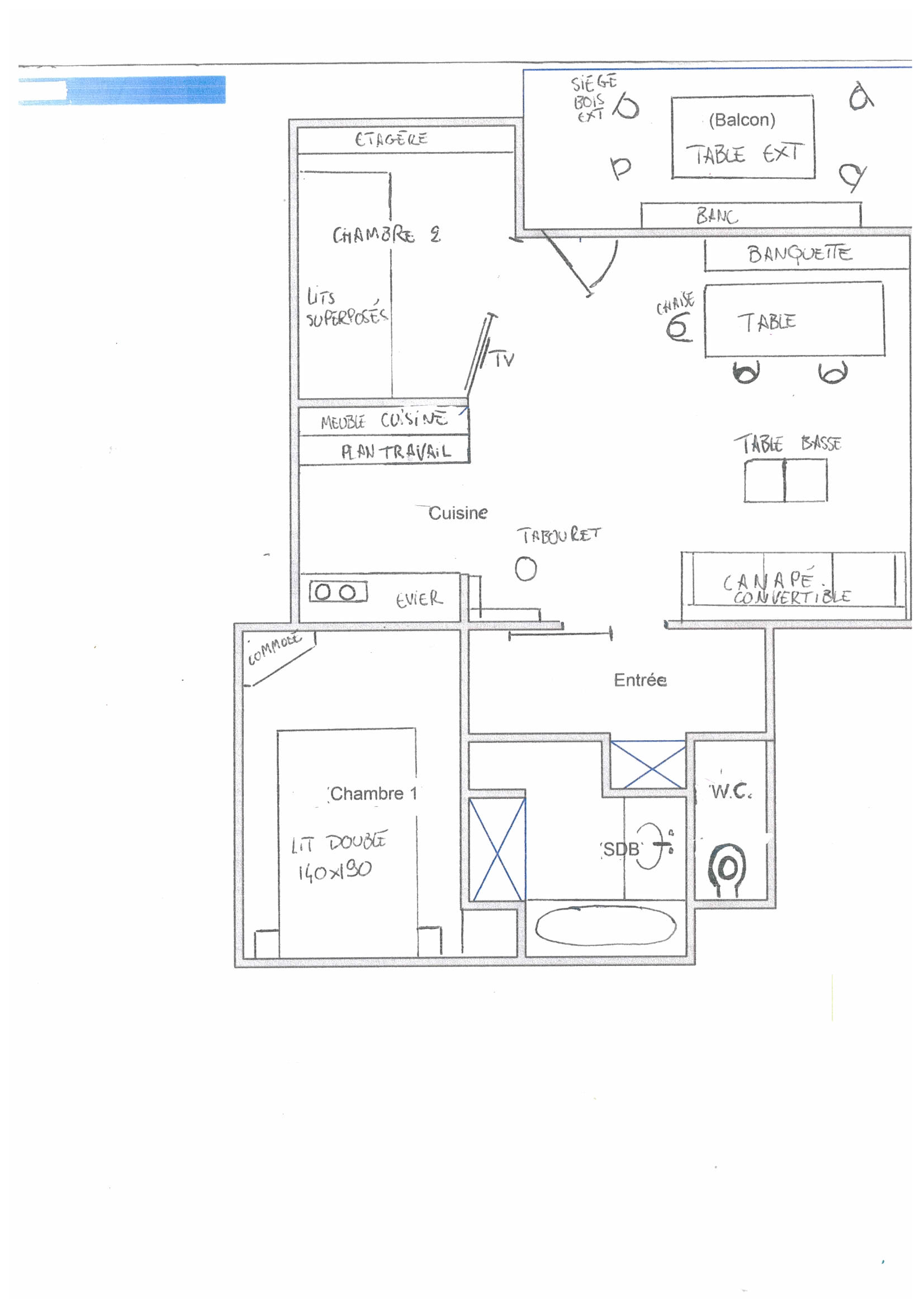 Au 3ème étage de la résidence, le séjour équipé de 2 lits simples avec lit gigogne et la télévision. Chambre avec lit double. Cuisine avec micro-ondes, lave vaisselle, 4 plaques électriques, réfrigérateur. Salle de bains et Wc séparés. Balcon. Le casier a ski est dans la résidence.