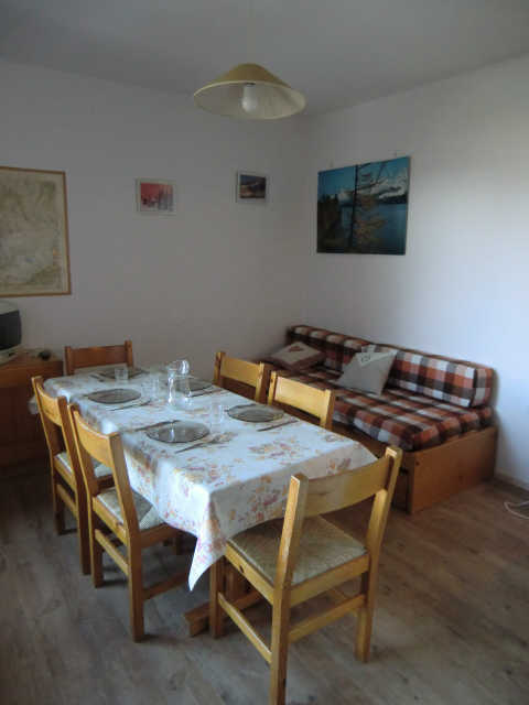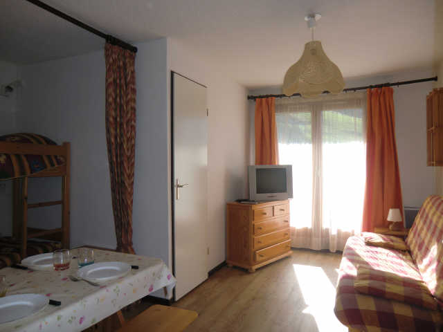 Appartement 5 personnes, 2 pièces, situé au 1er étage sans ascenseur, exposé NORD-OUEST, vue sur la vallée, avec balcon, casier à skis individuel RDC. SEJOUR: lit gigogne 2 pers., TV. CHAMBRE: lits superposés, lit gigogne 2 pers. COIN CUISINE: 4 plaques électriques, réfrigérateur, four; grille pain, cafetière électrique. SALLE DE BAINS: baignoire, lavabo. WC séparés. Petite résidence près du village, des pistes et des commerces.