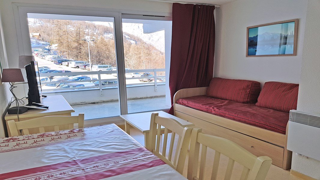 Ce petit studio de montagne de 17 m² avec 4 couchages, se situe au 2eme étage avec ascenseur de la résidence Podium, à Puy Saint Vincent 1600, aux pieds des pistes.