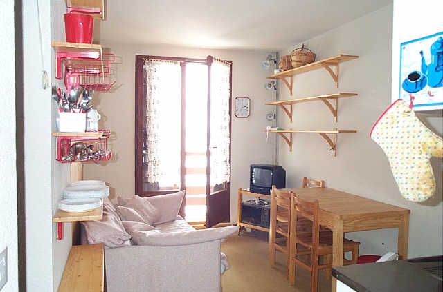 Studio cabine 4 couchages d'environ 30 m² avec balcon exposé sud. Séjour avec clic-clac et cabine avec 2 lit simples (1 en hauteur). Salle de bains et WC séparés. Equipement: téléviseur couleur, réfrigérateur, four, 4 plaques électriques, cafetière électrique, grille-pain électrique. Parking collectif.