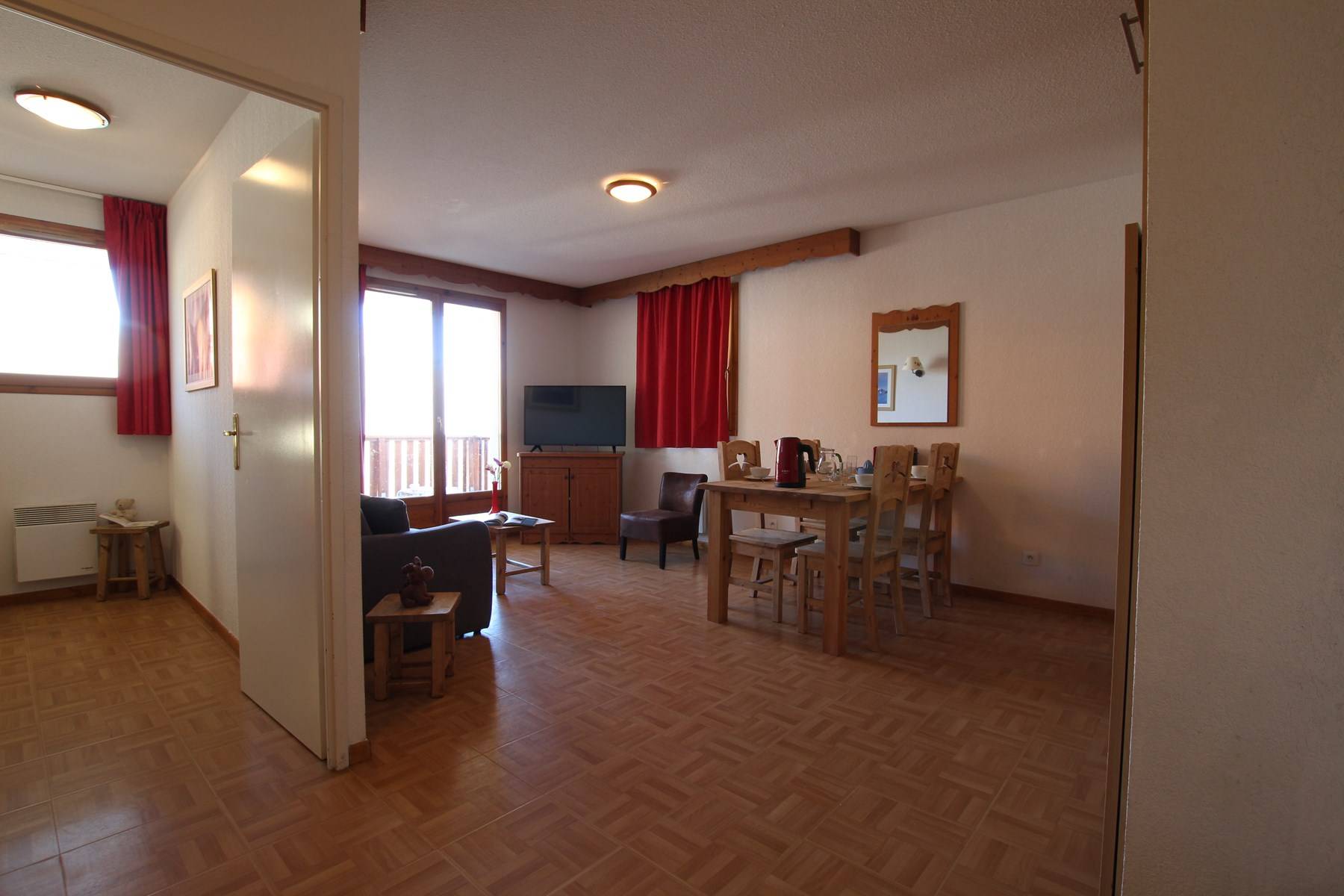 L'appartement comprend une chambre avec 2 lits simples et un coin montagne non séparé du séjour avec lits superposés. Le séjour est composé d'un canapé convertible 2 places. Le coin cuisine est équipé. Vous disposez d'une salle de bain avec baignoire et de WC séparés.