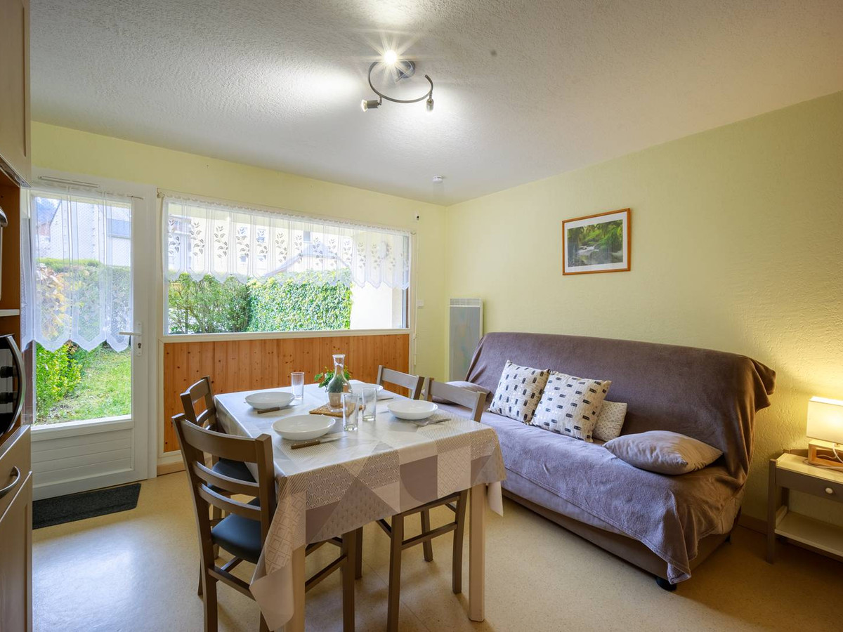 La kitchenette est toute équipée, ouverte sur le séjour avec son canapé lit confortable, télévision et table de salle à manger.