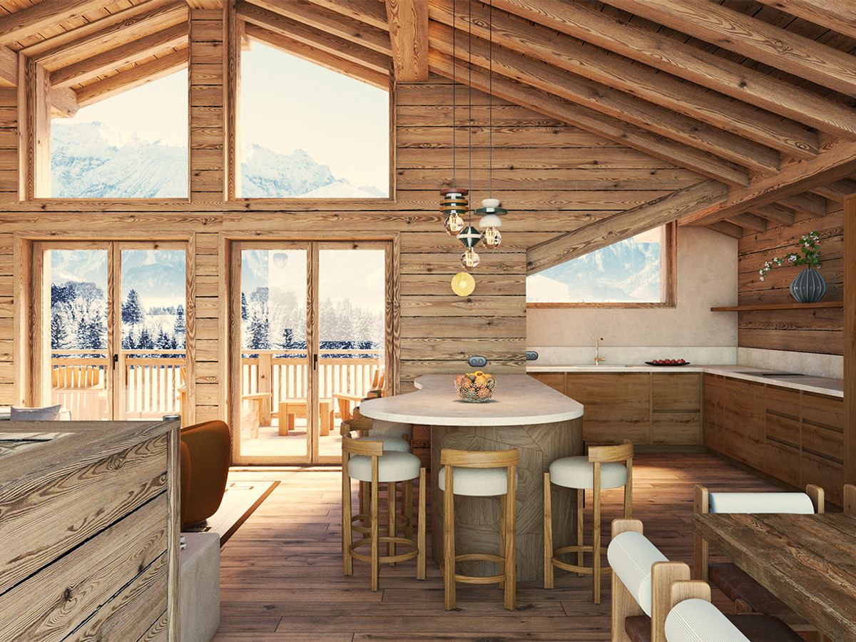 Une grande cuisine, la salle à manger, un bar et le salon font face aux plus belles vues sur la vallée, le village et les pistes. La hauteur sous plafond et la charpente traditionnelle y sont spectaculaires. Vous pourrez profiter d’un système audio de qualité pour écouter vos musiques préférées en buvant un bon verre de vin au coin du feu tout en contemplant les vues exceptionnelles sur le village, la vallée et la montagne environnante.