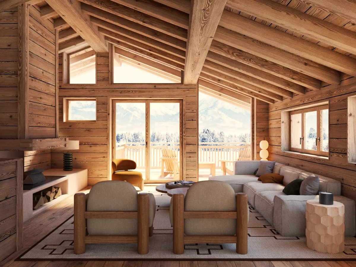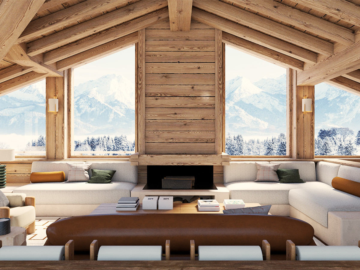 Le dernier étage du chalet est une immense pièce à vivre, entourée de larges baies vitrées qui jouxtent deux grandes terrasses.