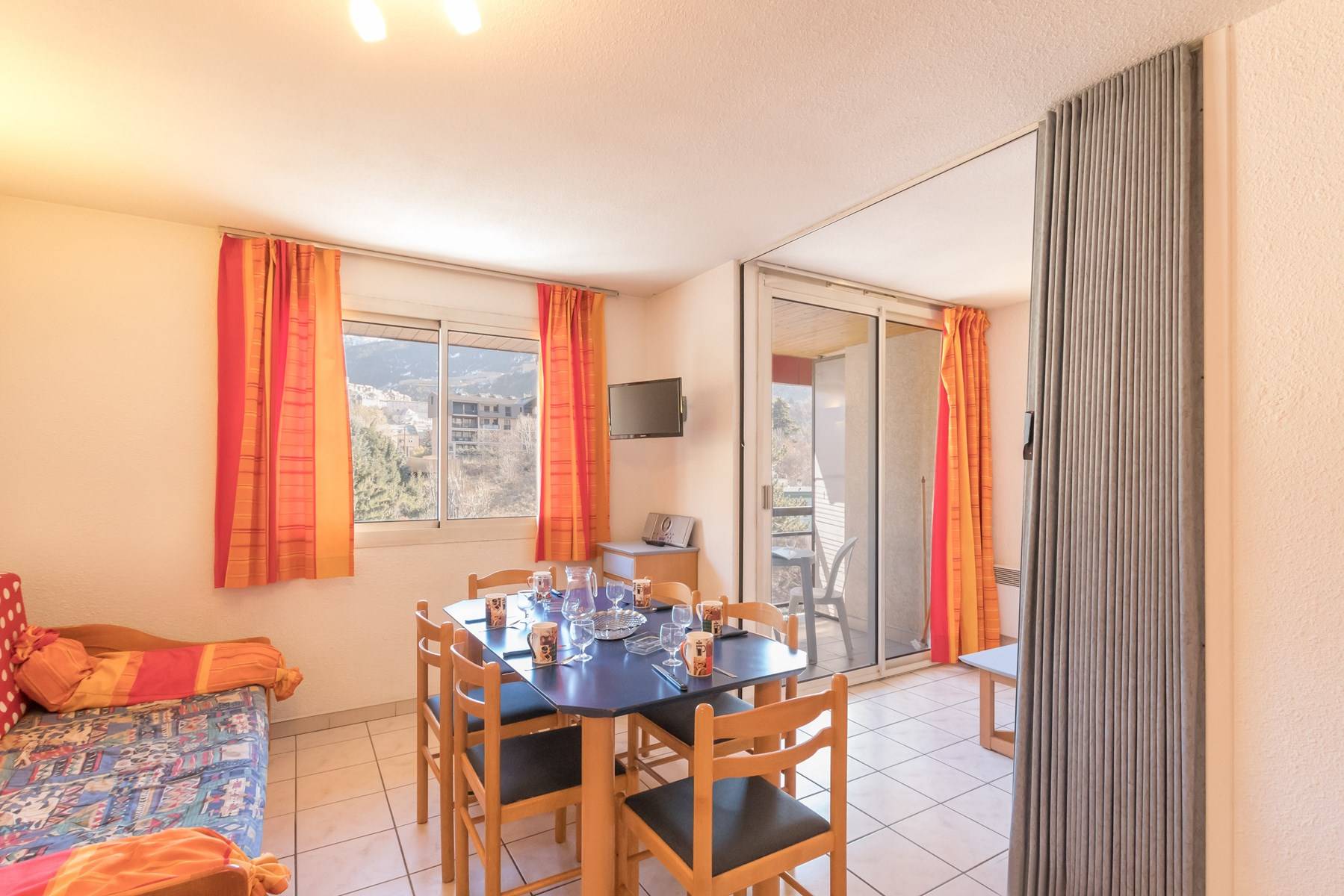 Joli appartement de deux pièces avec coin montagne, classé 2 étoiles, 30m² pour 4 à 6 maximum situé au 4ème étage de la résidence Relais de la Guisane avec ascenseur, à seulement 50m de la télécabine du Prorel et à 200m du centre de Briançon (passerelle piétonne devant la résidence).