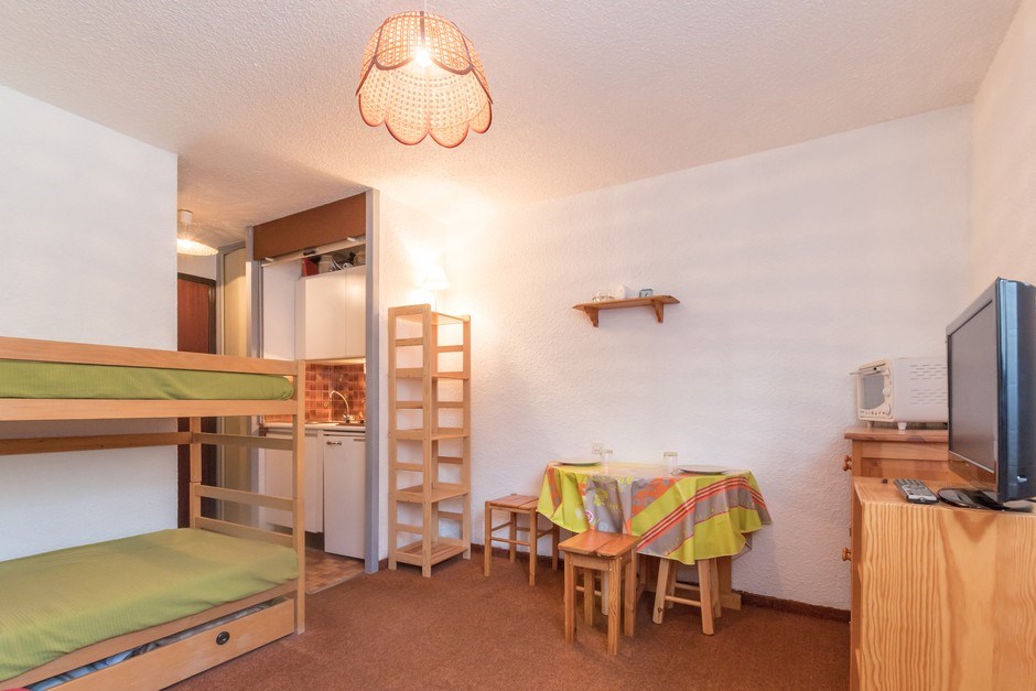Studio agréable pour 4 personnes avec un coin nuit fermé par une cloison coulissante (lit en 140), un séjour avec couchage pour deux personnes (canapé lit), + téléviseur.