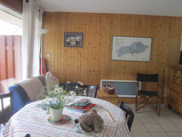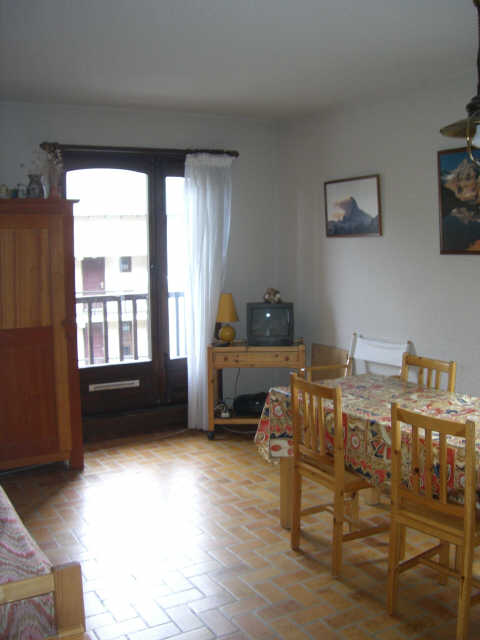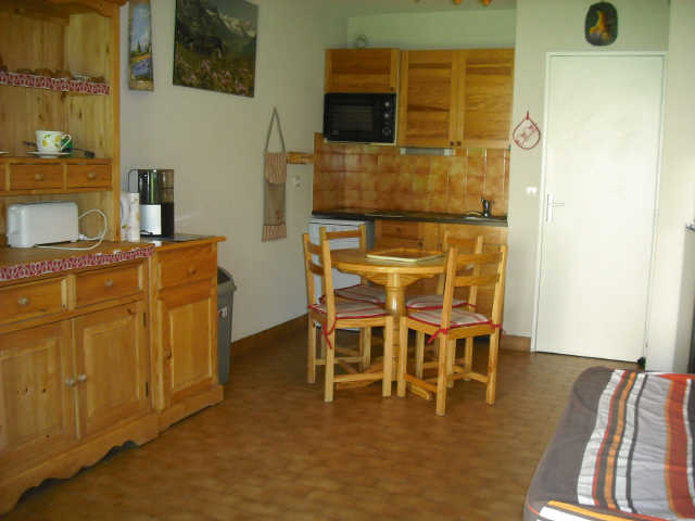 Studio + coin montagne fermé d' environ 30 m² situé au RDC d'une petite résidence de 3 étages. Petite chambre avec 2 lits superposés (couchage inférieur double). Salle de bain avec wc. Séjour exposé sud avec terrasse, canapé-lit pour 2 personnes, TV, coin cuisine équipé, plaques électriques, four, réfrigérateur.