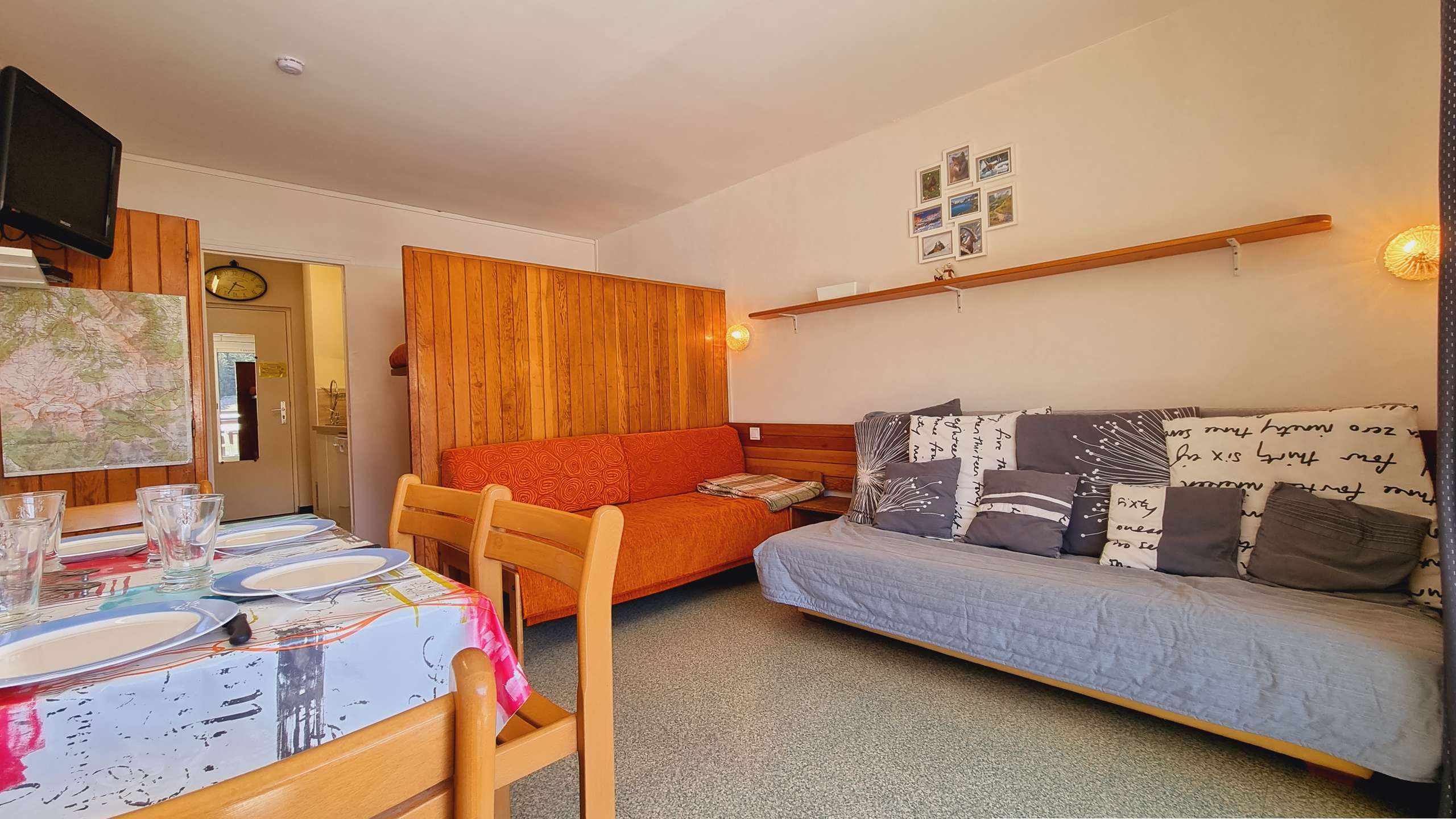 Séjour avec coin-repas canapé lit 2 personnes, séparé du coin montagne avec lit superposé, TV comprise.