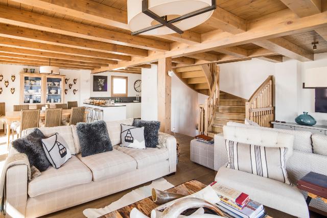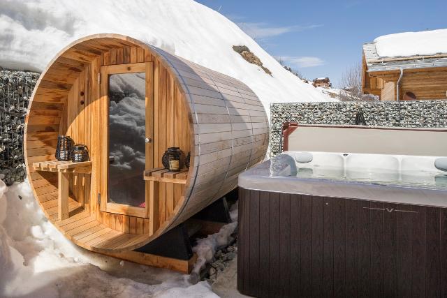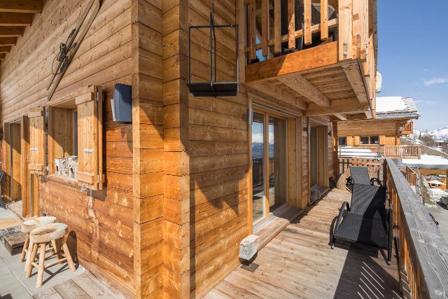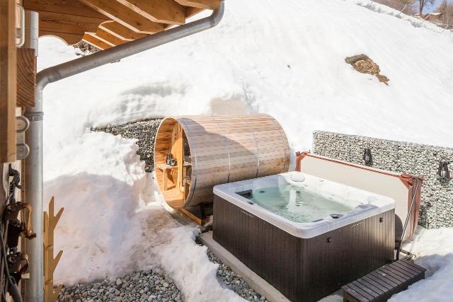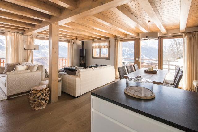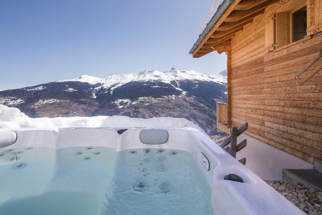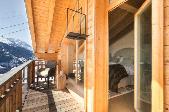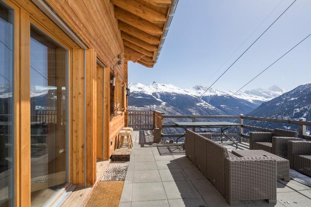 Splendide chalet de 200m² de conception moderne, environnement calme. Equipements haut de gamme, jacuzzi et sauna extérieurs. Terrasse et vue magnifique sur les Alpes suisses, accès skis aux pieds aux pistes des 4 Vallées. 4 chambres pouvant accueillir jusqu’à 8 personnes.