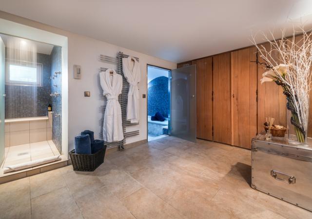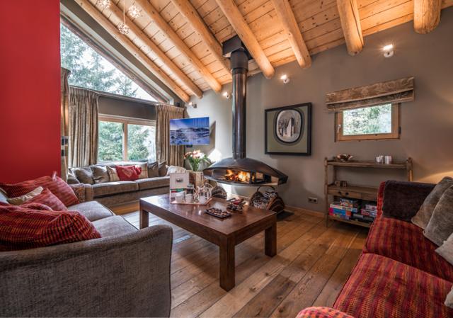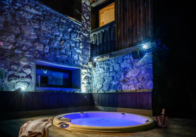 Chalet : Style traditionnel et moderne. 5 Chambres réparties sur 3 étages. Espace bien-être avec hammam, espace de massage et bain à remous extérieur. Salon avec cheminée suspendue, bar et terrasse ensoleillée. Accès Wifi et télévision inclus.