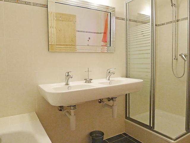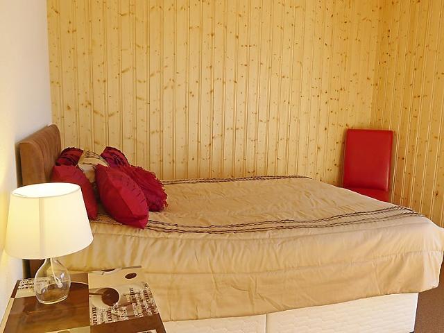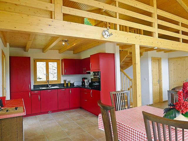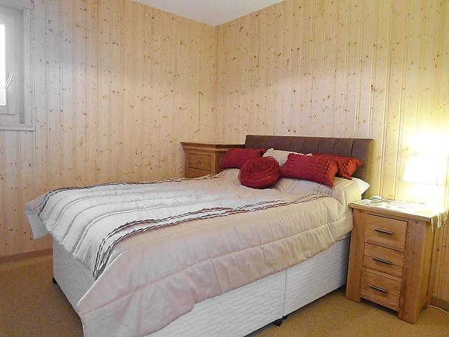 "Chalet Double Rouge", chalet 4 pièces 125 m2 sur 2 niveaux, situation sud. Aménagement agréable et moderne: séjour/salle à manger avec table pour les repas. Sortie sur le balcon, orientée sud. Cuisine ouverte (four, lave-vaisselle, 4 plaques vitrocéramiques). Sortie sur le jardin. Douche/WC. À l'étage inférieur: 1 petite chambre avec 1 grand-lit (140 cm, longueur 200 cm). 1 chambre avec 1 grand-lit (140 cm, longueur 200 cm). Sortie sur la terrasse, orientée sud. 1 petite chambre avec 1 grand-lit (140 cm, longueur 200 cm). Sortie sur la terrasse, orientée sud. Bain/WC, double vasque. À l'étage supérieur: mansardé, ouvert 1 chambre d'enfants, hauteur plafond 210 - 140 cm, sans armoire avec 1 couchage (75 cm, longueur 180 cm). Grand balcon, situation sud, grande terrasse 30 m2, situation sud. Meubles de terrasse. Très belle vue panoramique sur les montagnes. A disposition: lave-linge.